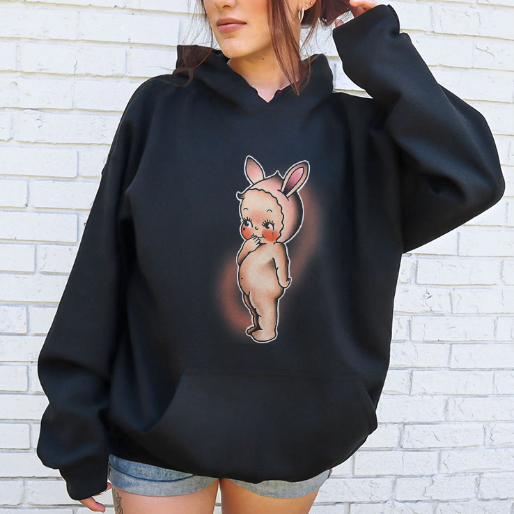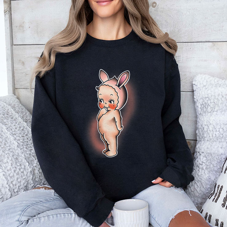 A soft blush tints the cheeks of a tiny baby bunny, its round eyes brimming with a playful gleam. The delicate pink ears stand upright, framing the character’s cherubic face, while a faint halo of light pulses gently around the figure, emphasizing its mischievous charm. This Kewpie bunny shirt captures a retro kawaii spirit, balancing sweetness and cheek with a simplicity that feels both fresh and nostalgic. The baby bunny’s expression hints at a sly secret, appealing to those who appreciate a touch of whimsy in their wardrobe. It’s not just about cute imagery; it’s a subtle nod to a certain kind of personality—someone who enjoys quirky details and a bit of lighthearted fun without being overly loud. The minimal background lets the character shine, making the shirt an easy fit for casual days, whether running errands or catching up with friends over coffee. Ideal for young adults who lean into novelty apparel or anyone searching for a playful gift, this Kewpie bunny shirt carries a lively spirit that blurs the line between costume charm and everyday wear. It fits hand-in-glove with cosplay fans drawn to unique, understated designs, or anyone who likes their outfits with a side of personality and nostalgia. A quiet but unmistakable pop of character woven effortlessly into daily life.
