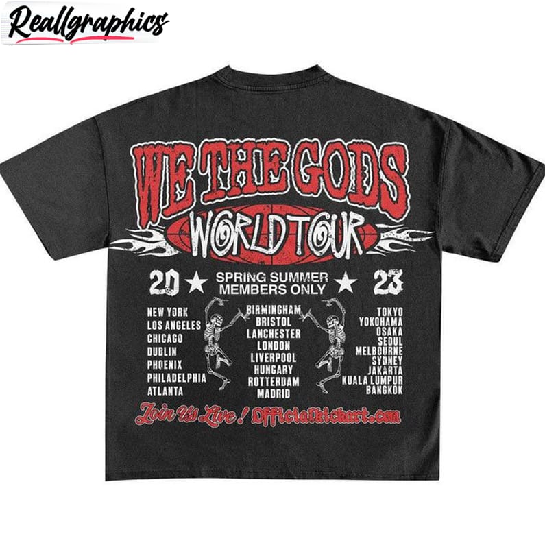 This sweatshirt design is inspired by the uniqueness of vintage clothing and the rock-n-roll aesthetics of the World Tour merchandise. It comes in a classic crewneck style, encapsulating the retro spirit while ensuring contemporary comfort. The distinct 'We The Gods' graphic print adds an edge and transforms this sweatshirt into a conversation starter. You'll find this piece is a true nod to the past, appealing to those with an appreciation for nostalgia and iconography. A perfect blend of vintage and modern style, this sweatshirt is a must-have for anyone seeking to make a bold fashion statement.