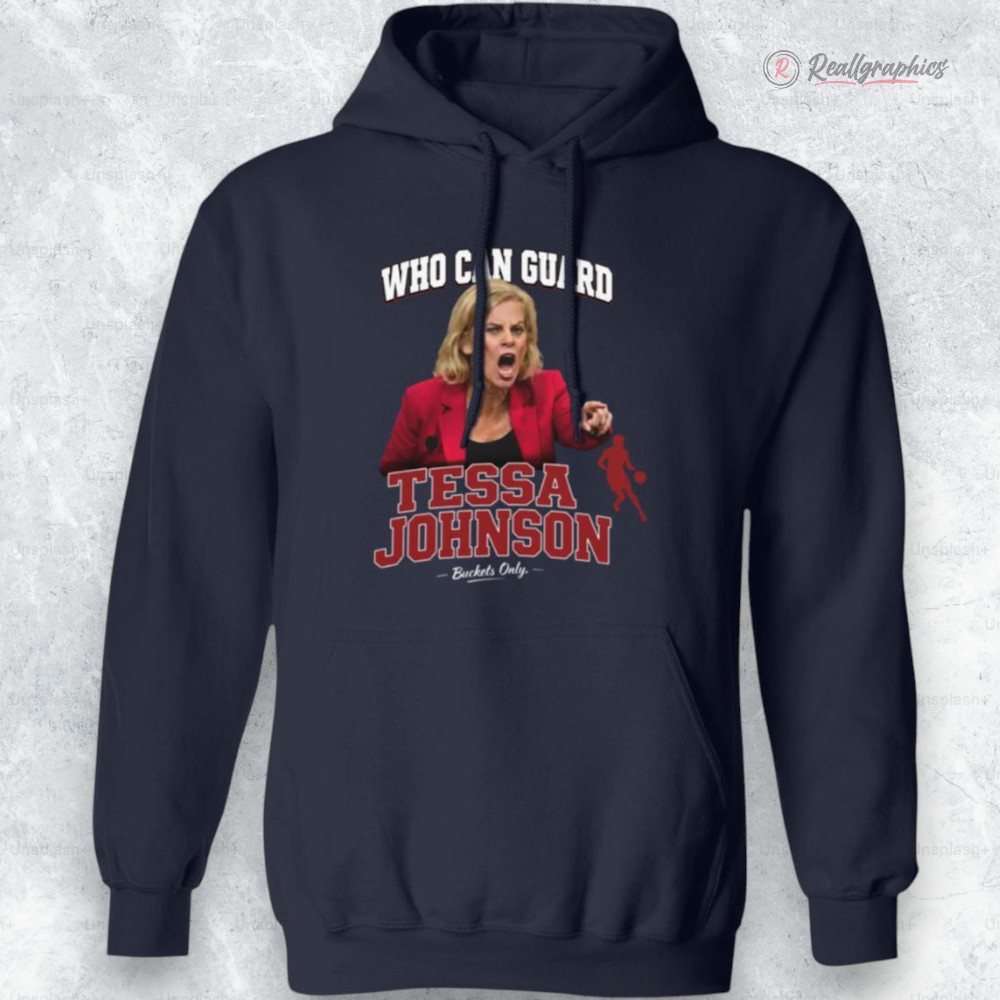A woman in a striking red blazer leans into the moment, mouth open mid-shout, eyes sharp with fierce determination. Above her head, bold varsity block letters arch confidently with the question, “WHO CAN GUARD,” while her name, TESSA JOHNSON, stands grounded beneath in a no-nonsense uppercase font. The navy and patriotic red palette pulses through the design, balanced by a subtle basketball silhouette tucked in the corner—a silent nod to the court’s competitive spirit. The overall energy feels charged, ready for action, and utterly unapologetic. This is more than just a Tessa Johnson hoodie. It’s a statement about standing out and owning the game day crowd with pride and a bit of attitude. The athletic vibe speaks to those who don’t just watch basketball but live it through every triumphant play and playful rivalry. Wearing it is a way of saying you recognize toughness and respect the hustle, whether cheering from the stands or hitting the gym after class. Pairing the hoodie with classic denim or joggers keeps the boldness grounded in everyday comfort, while built-in confidence carries you from casual hangouts to spirited team gatherings. It’s the kind of piece that clicks with someone who values individuality—as much about self-expression as it is about loyalty to a player who demands attention. For anyone captivated by Tessa Johnson’s fearlessness, this hoodie fits naturally into that narrative, making a statement as clear as the name sprawled across the chest.