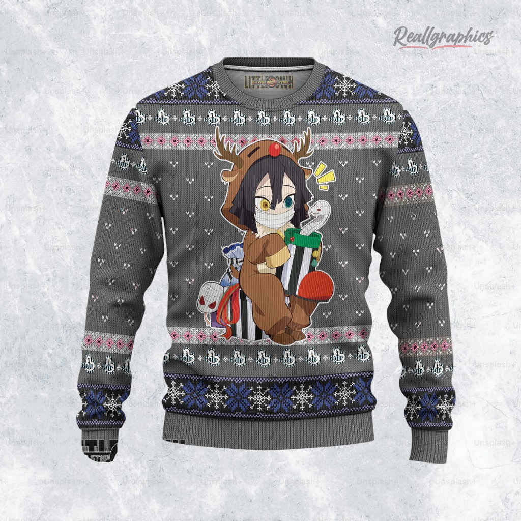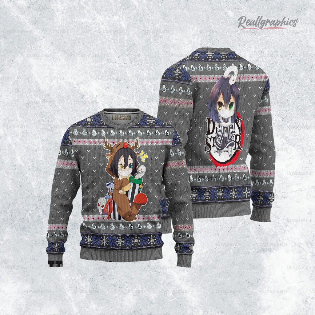 Who said demons can't join in on holiday fun? This sweater features Obanai dressed adorably as a reindeer, complete with a mischievous snake buddy peeking at gifts. It's a playful twist perfect for fans of both winter cheer and anime action. Whether you're cozying up or heading to a holiday party, this design is sure to bring smiles. Grab yours today!