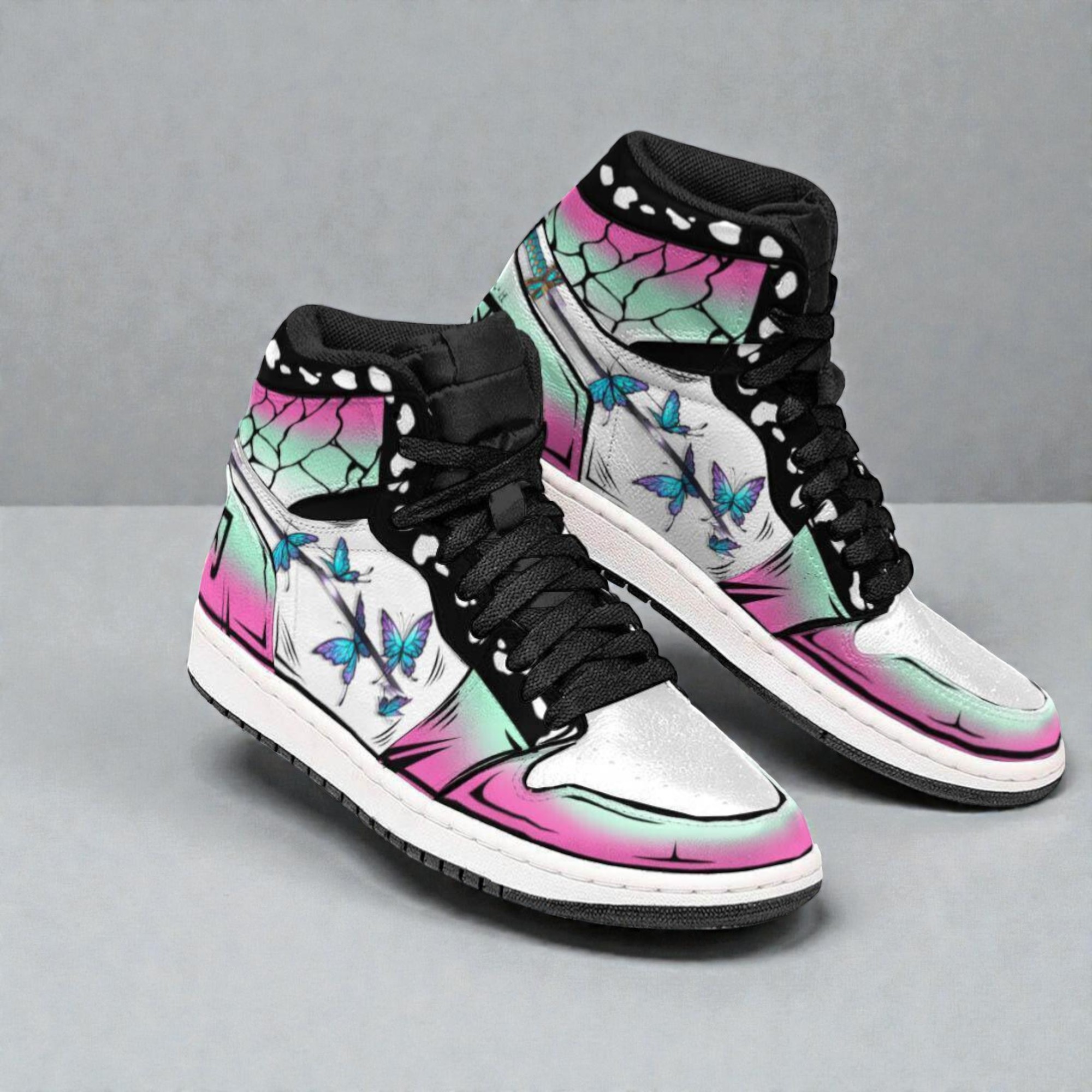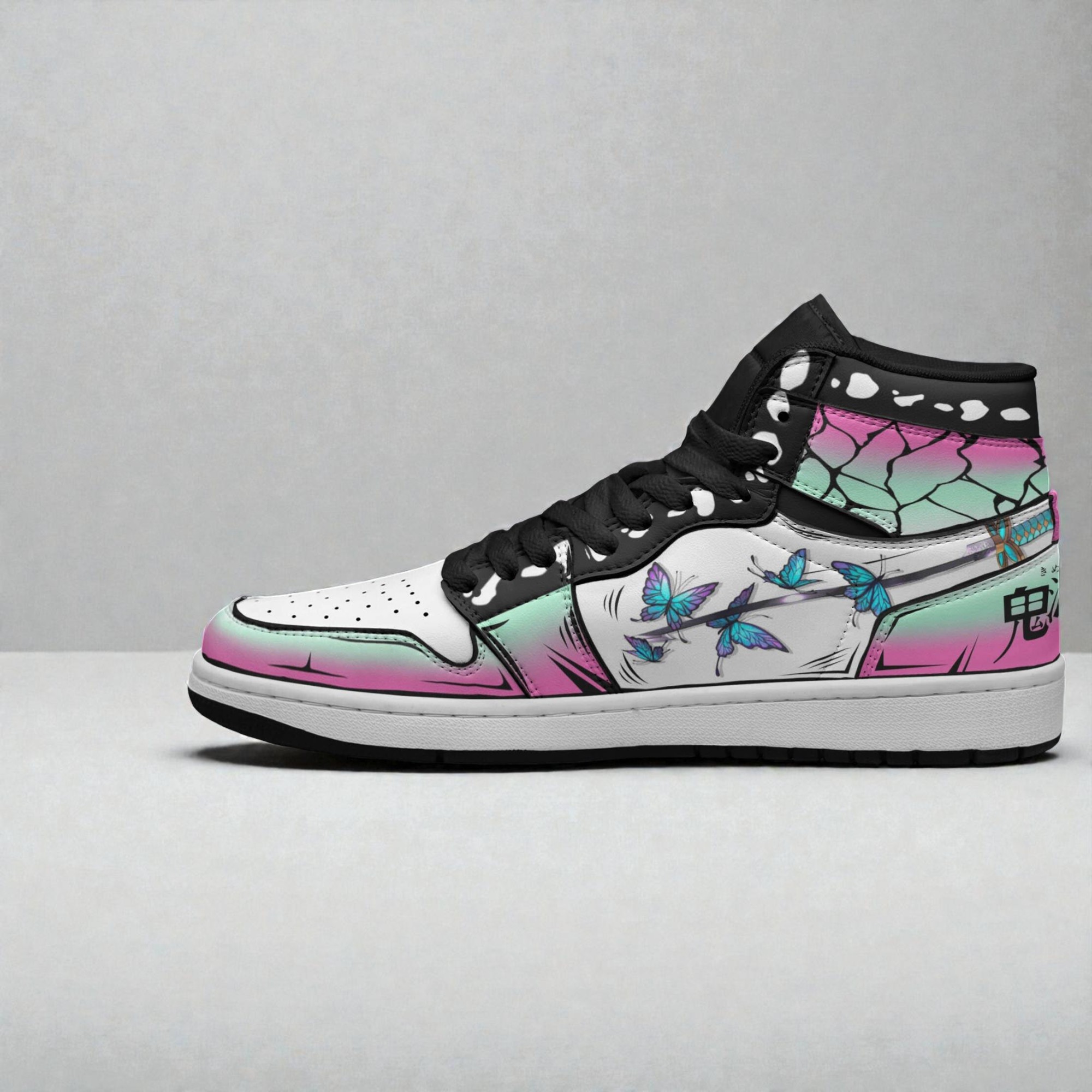 Kochou Shinobu is a character known not just for her quiet strength but also for the delicate grace she carries, reflected in the way she moves and fights. These shoes capture that essence with thoughtful details that go beyond simple cosplay. The design draws from the cherry blossom and butterfly motifs, symbols closely tied to her elegant yet fierce persona. You’ll notice the white base paired with black accents, creating a clean canvas that lets the gradient pink and mint colors on the panels really stand out. Small touches like the cracked pattern at the heel and the kanji-like symbol add layers of meaning without overwhelming the design. The craftsmanship feels solid yet comfortable, blending sneaker streetwear influences with cosplay aesthetics. They’re lightweight enough to wear at a convention or just around town, giving fans a way to nod to the character in everyday settings. These Kochou Shinobu cosplay shoes don’t just sit on a shelf; they invite you to slip into Shinobu’s world with every step. They’re a great fit for anime cosplay fans who appreciate subtle but meaningful design, as well as sneaker enthusiasts who look for bold, graphic styles with a story behind them. Whether you’re gifting for a close friend who collects anime memorabilia or adding to your own cosplay rotation, these shoes offer a playful yet stylish way to connect with a favorite character.