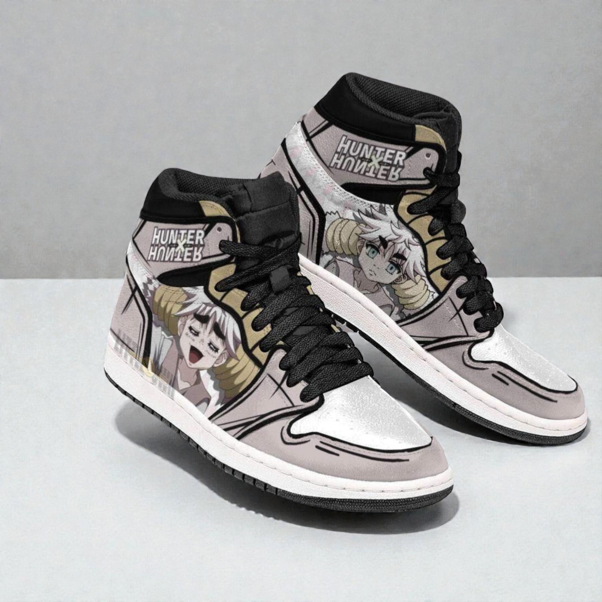 In the world of Hunter x Hunter, every character and battle brings a distinct energy, and these shoes capture that spirit through their bold, graphic streetwear design. The high-top silhouette is a canvas for sharp, stylized lines and thick black outlines that echo the manga’s intense illustrations. Against a soft pastel background, the custom anime character artwork stands out with vibrant clarity, offering a balance between dynamic action and a subtle, modern vibe. Typography plays a subtle but impactful role—blocky, uppercase letters outlined on the heel ground the design with a strong visual signature. It’s a detail that mirrors the structured, yet playful, energy found throughout the series. The printed panels are thoughtfully placed to maintain a cohesive flow, wrapping around the shoe in a way that suggests movement, much like the nimble Hunters themselves. This Hunter x Hunter sneaker is more than just footwear; it’s a nod to the fandom’s deep appreciation for storytelling through visuals. It appeals to those who love anime as an expression of identity—combining passion with everyday style. Fans who enjoy subtly letting their interests peek through in casual settings will find these sneakers fit naturally into their rotation, whether worn for conventions, casual outings, or simply as a reminder of the adventures within the Hunter x Hunter universe.Komugi Shoes Custom Hunter x Hunter Anime Jordan Sneaker Boots