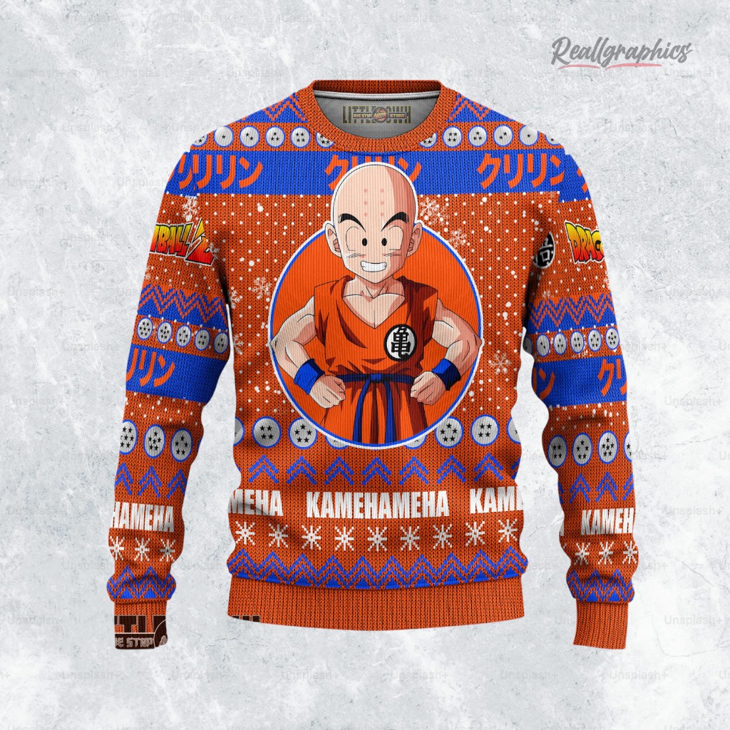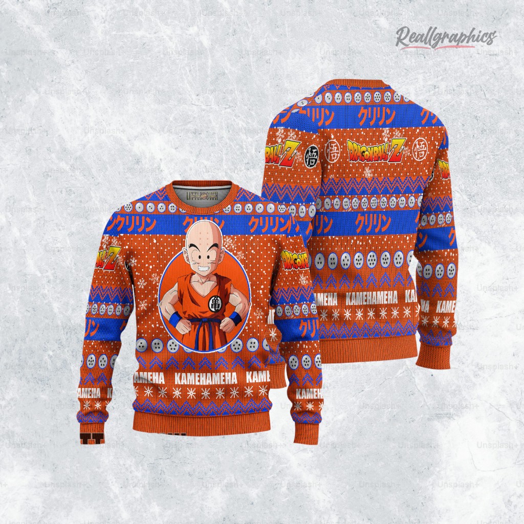 'Tis the season to be geeky! Rock the ultimate Dragon Ball Z Christmas sweater featuring everyone's favorite human, Krillin! Perfect for holiday parties or cozy nights watching anime. Get yours now and power up your holiday cheer!