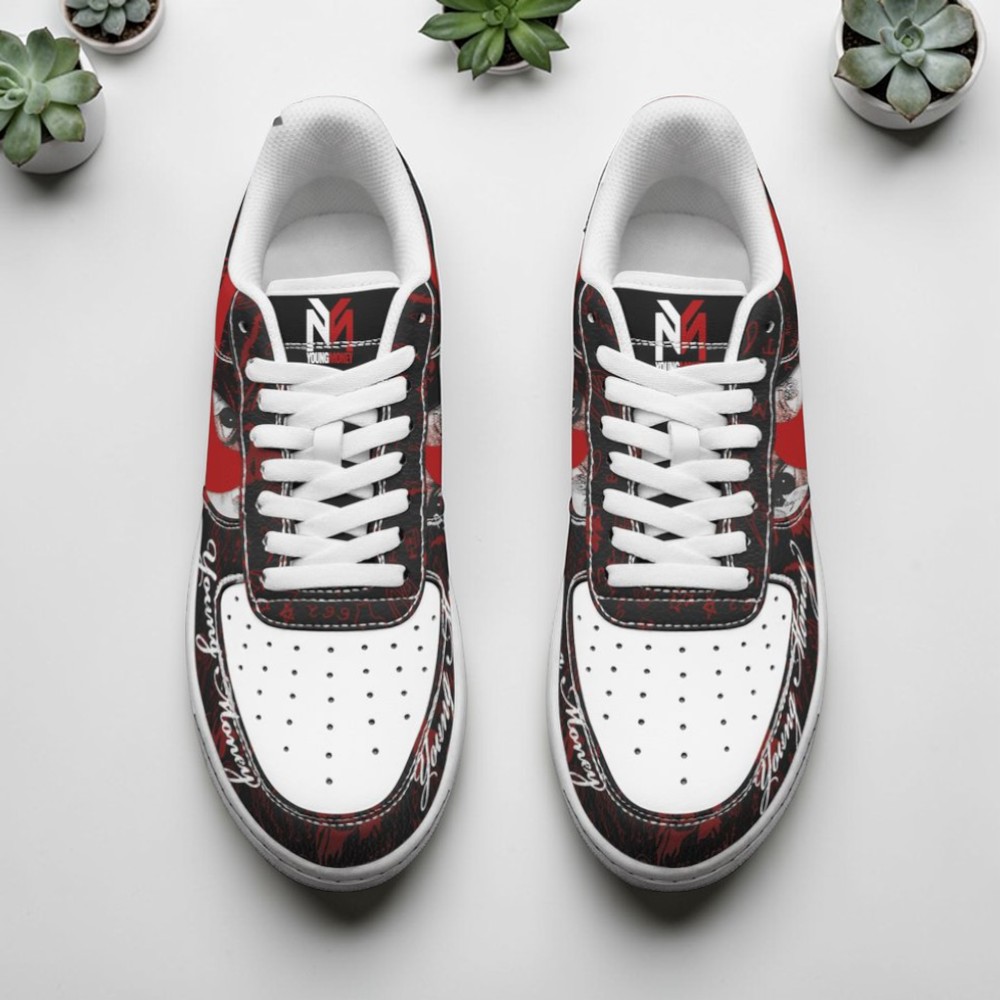 The sharp contrast of red and black splashes across a crisp white base sets a powerful tone the moment you catch sight of these sneakers. Each shoe tells a story in script and bold strokes—stylized initials and decorative flourishes trace the edges around the toe, while the tongue bears a distinctive logo that nods to a deep-rooted culture. They carry the energy of the streets, that gritty rhythm pulsing through every beat of a Lil Wayne track. For those who follow Young Money’s legacy or have grown up with Tha Carter series as their soundtrack, this design is more than just decoration. It’s a badge of identity and a subtle shout-out that blends confidence with an artistic edge. The bold graphics reflect not just style but personality—the wearer's choice to stand unapologetically in sync with a community defined by its sound and swagger. Collectors or fans who live for that blend of music and streetwear will find these shoes fitting seamlessly into their everyday swagger—whether at a concert or simply out with friends marking their place in a shared culture. Offering them as a gift carries that same spirit, a thoughtful gesture to someone who recognizes the significance of the details and what they represent beyond the surface. Within sneaker culture, these shoes hold a certain status, a reminder why the Lil Wayne Tha Carter V Air Force 1 endures as more than just footwear.Lil Wayne Tha Carter Vi Young Money Air Force 1 Shoes