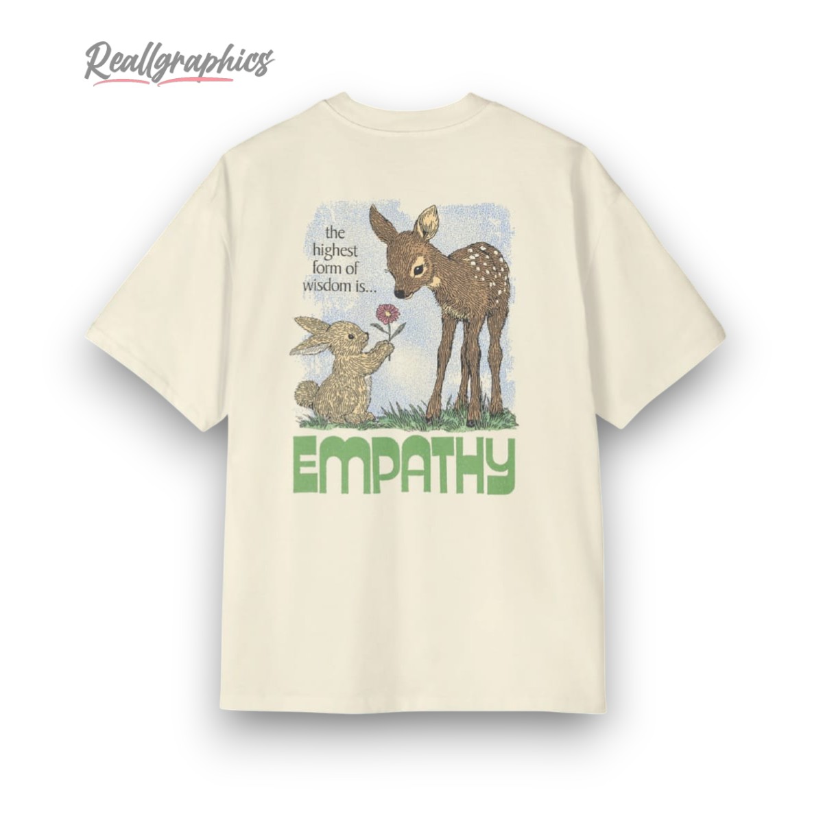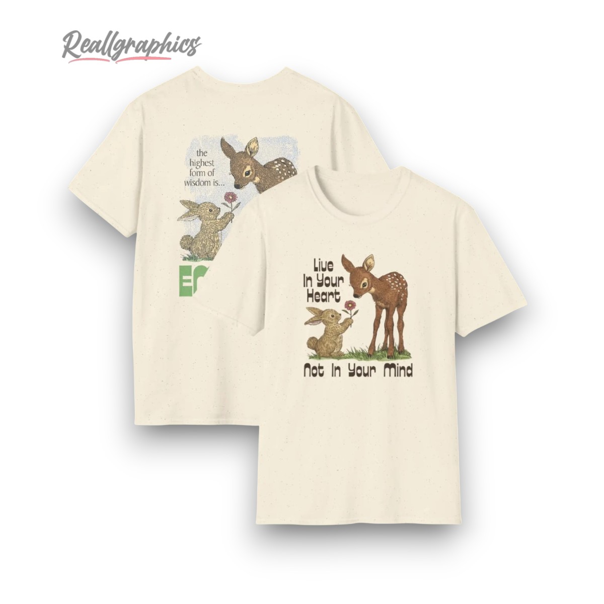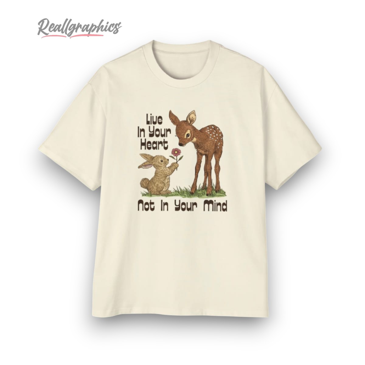 Discover a serene message with this charming design. A gentle fawn and a whimsical rabbit share a tender moment, inspiring a heart-centered life. Perfect for those who cherish nature and mindfulness, this print speaks volumes without saying a word. Add a touch of warmth to your wardrobe with this adorable and uplifting artwork.Live In Your Heart Not In Your Mind Shirt
