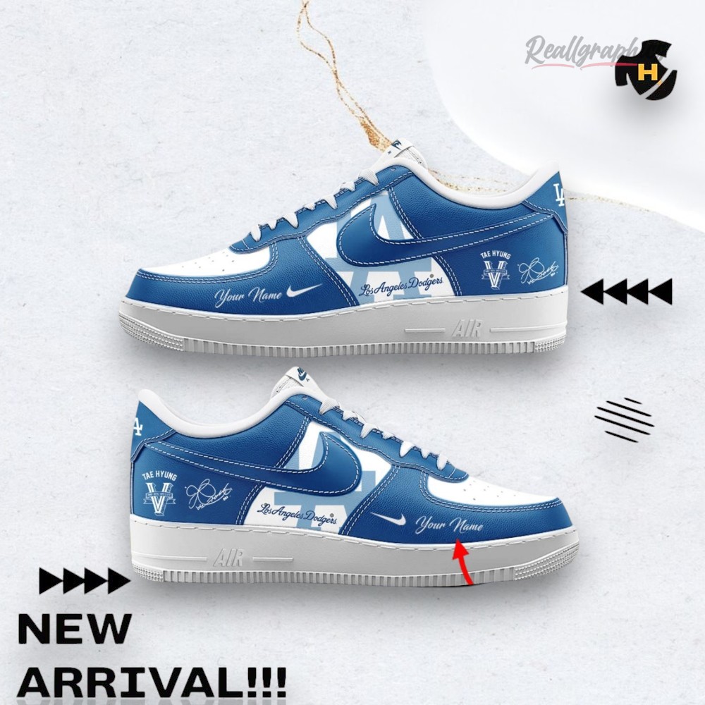 Rep your favorite team and artist with these custom kicks! Combine your love for the Dodgers and V from BTS with these unique Air Force shoes. Perfect for any LA Dodgers merchandise collector or ARMY member looking to add some flair to their wardrobe. Get yours now!