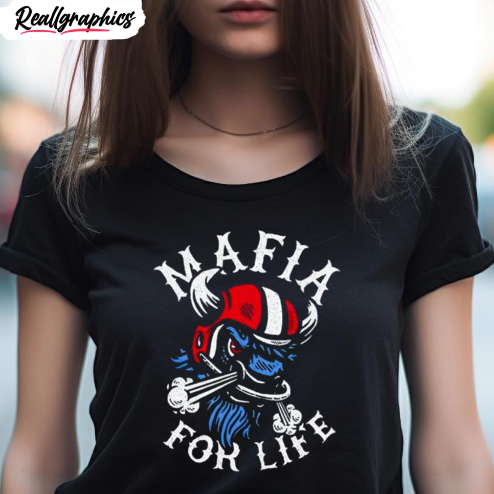 This Mafia For Life Buffalo Bills Shirt is the perfect addition to any fan of the Buffalo Bills. This stylish t-shirt features a bold Buffalo Bills logo on the front and the phrase Mafia for Life printed on the back in bright red lettering. The lightweight, breathable materials make this shirt comfortable to wear any time of the year. It's great for showing your team pride on game day or any day of the week. Whether you're at the tailgate or in the stands, this Buffalo Bills shirt will make sure everyone knows that you're a devoted Bills fan.