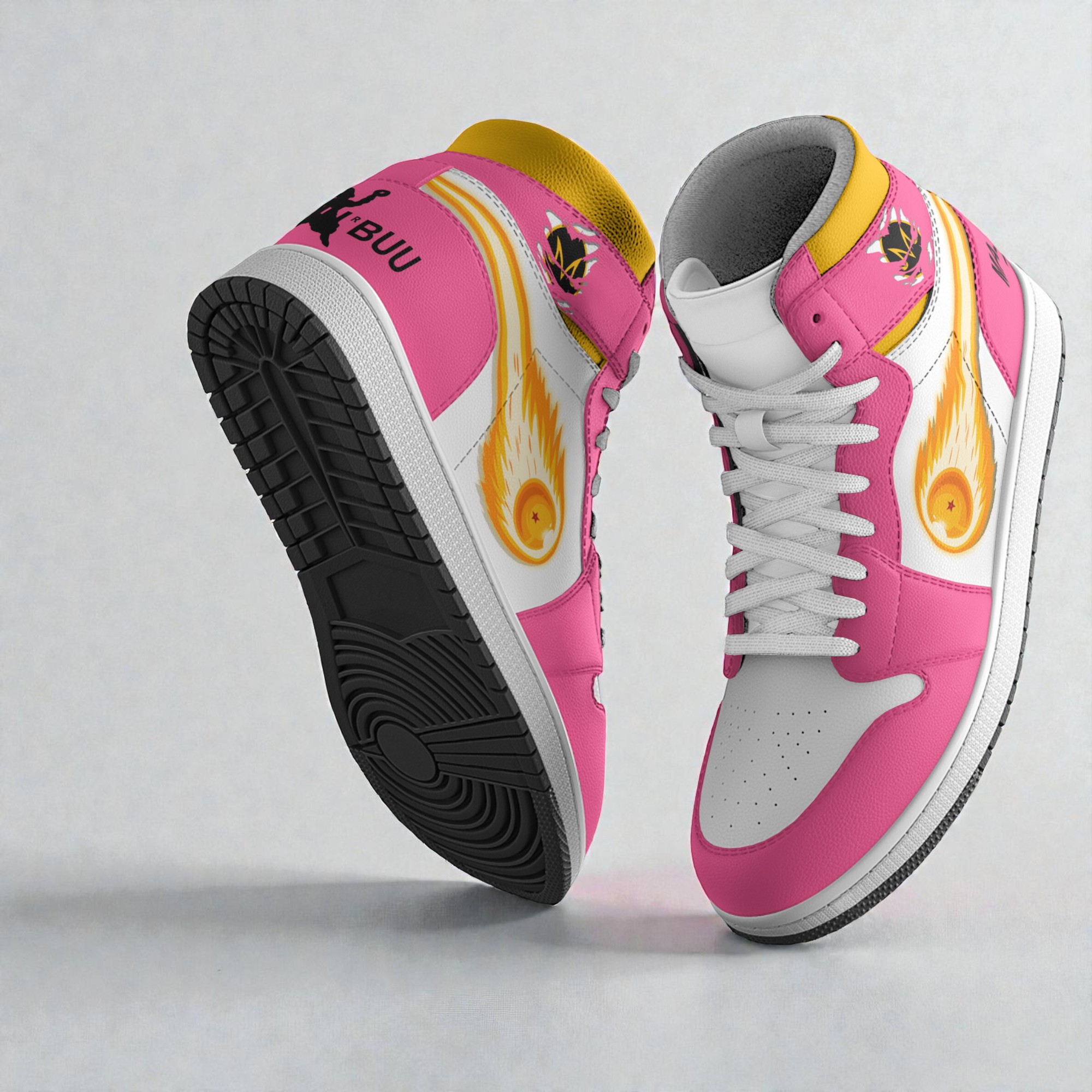 A splash of soft pink dominates the silhouette, interrupted by flashes of white and yellow that mimic the energy and motion of Dragon Ball’s iconic flame motifs. The low-key Majin Buu emblem rests subtly on the side, more like a badge of identity than a statement, balanced by minimalist branding that hints at boldness without shouting. The combination feels playful yet intentional, a careful blend of color and shape that captures the character’s quirky spirit without overwhelming the eye. This is a shoe for someone who wears their fandom quietly confident, someone who appreciates intricate design that speaks to a shared cultural language. It’s not just about Dragon Ball or anime; it’s about carving out space for self-expression in daily life. The vibrant colorway brings energy to casual wear, making each step a small act of declaring individuality—not flashy, but unmistakably you. Collectors and longtime fans of the show will find the design resonates beyond nostalgia, bridging passion and style. It’s a reminder that sneakers can be more than just footwear—they can unfold stories and identities, quietly woven into everyday moments. Whether worn to conventions, weekend outings, or just as a thoughtful gift for those who treasure the anime world, these Majin Buu sneakers offer a pulse of playful energy grounded in personal style.Majin Buu Sneakers Custom Dragon Ball Anime Jordan Sneaker Boots