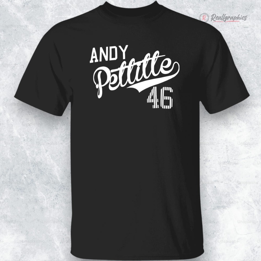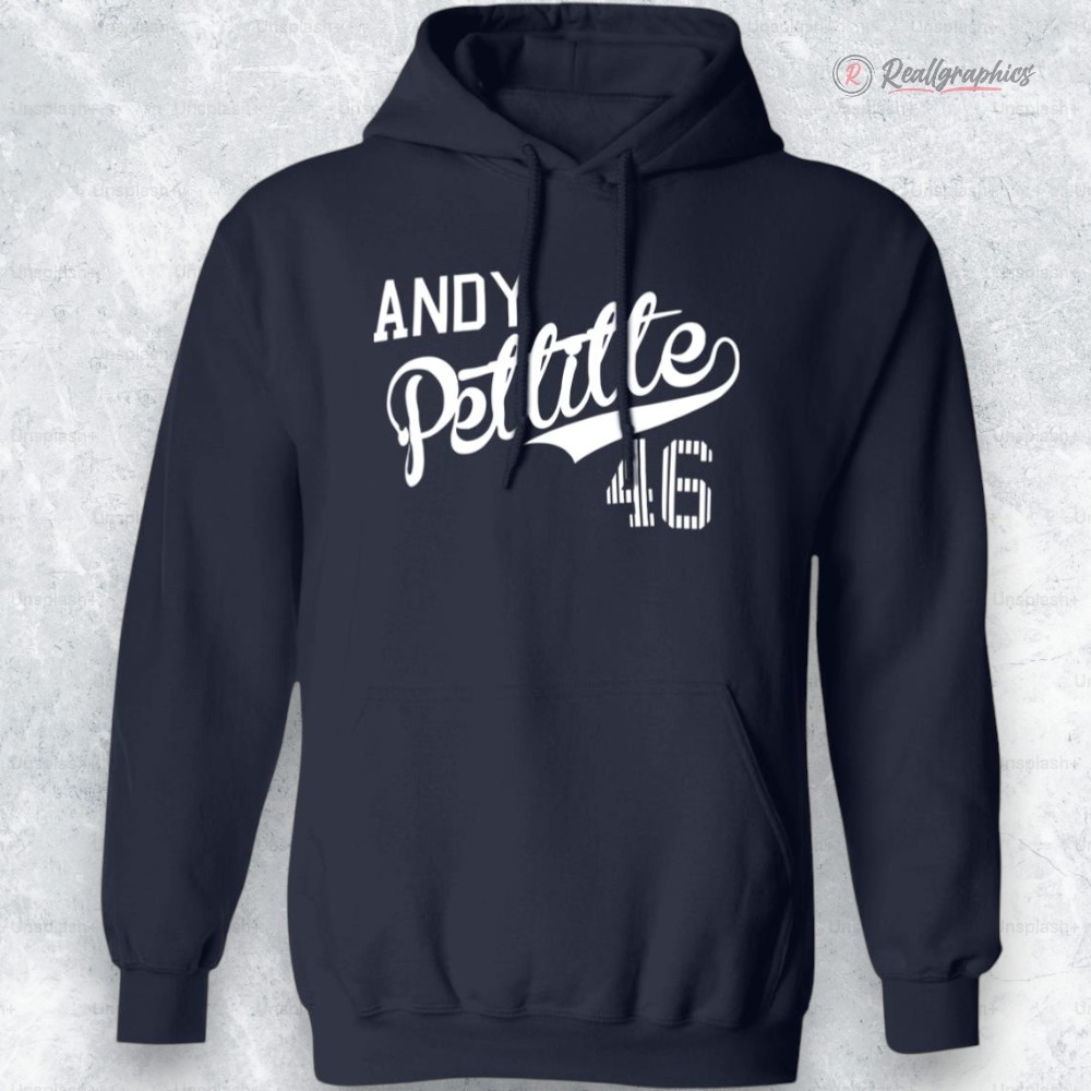 The sharp contrast between the bold uppercase “ANDY” and the flowing cursive “Pettitte” immediately commands attention. Nestled below, the number 46 stretches wide in a classic striped font that recalls the days of packed stadiums and crackling radios. This interplay of block sans and vintage script balances modern clarity with nostalgic charm, capturing a moment in baseball history that feels both vivid and timeless. The design’s placement centers the eye, as if the names and number were stitched onto the fabric of a classic jersey, making it less a hoodie and more a statement rooted deeply in sports heritage. It’s not just typography; it’s a visual tribute that mirrors Andy Pettitte’s blend of grit and grace on the mound. The stripes add texture and movement, echoing the rhythm of a fastball slicing through the air. Those who recognize the legacy will appreciate the craft here—fans who know what it means to wear a name with pride, whether in the stands or on casual weekend outings. It’s a piece that speaks to commitment, memories of championship runs, and the ongoing bond between player and supporter. For anyone who has followed the sport or admired its legends, this Andy Pettitte shirt feels like a subtle yet powerful nod to a shared history that goes beyond the game.