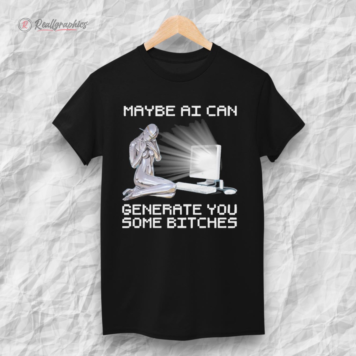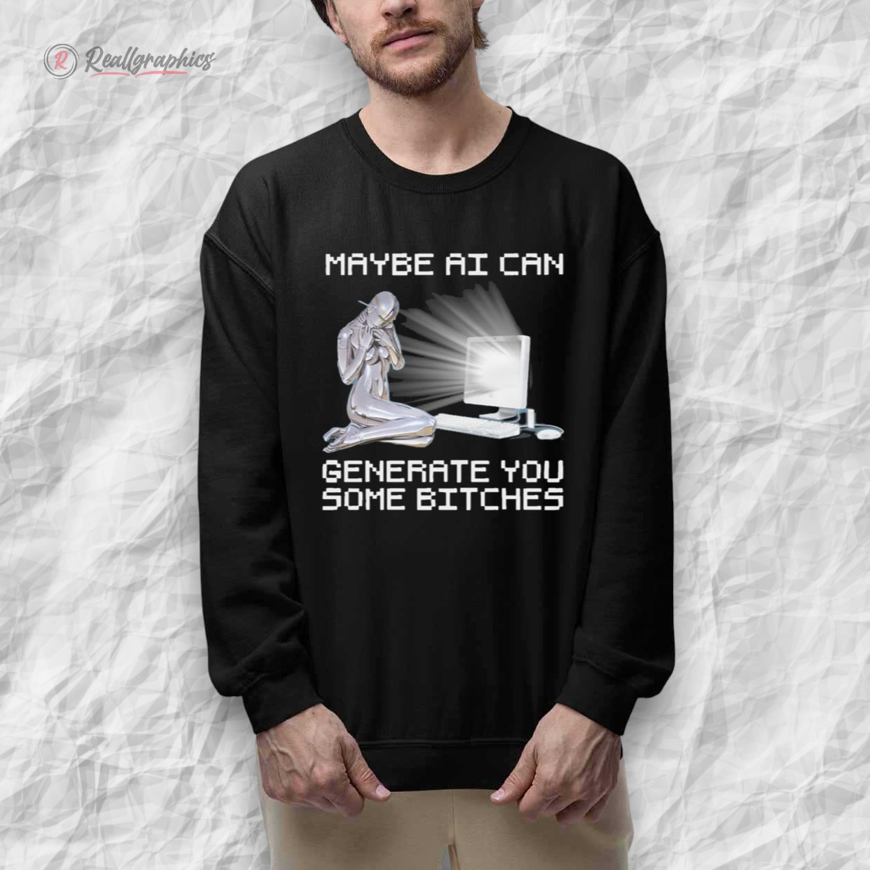This sweatshirt delivers the ultimate roast for the digital age. Mixing early 2000s "Y2K" aesthetics with modern internet slang, the design features a retro 3D chrome android praying to a glowing computer screen. The pixelated text delivers the punchline: "MAYBE AI CAN GENERATE YOU SOME BITCHES."