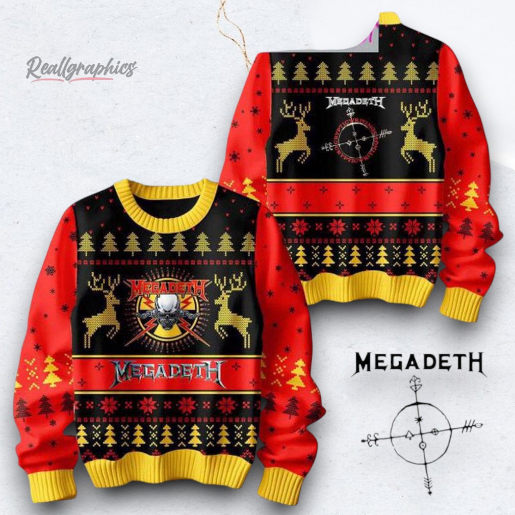 Rock out this holiday season with this killer Christmas ugly sweater! Deck the halls in metal spirit. Features iconic imagery and a festive design. Guaranteed to be a conversation starter at your next holiday gathering. Get yours now before they're gone!