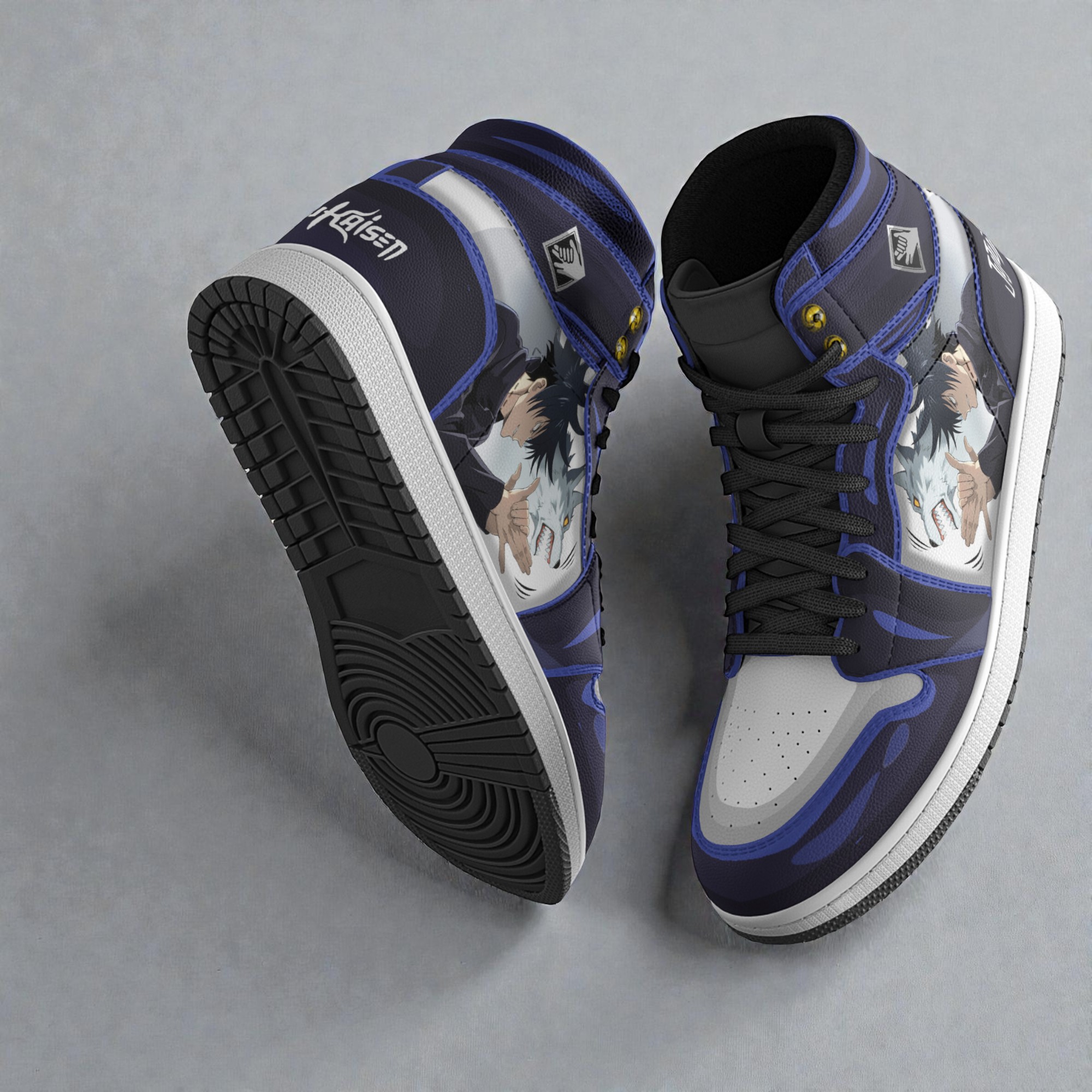 The side panels feature Megumi forming the exact hand sign for his Ten Shadows Technique, with the white Divine Dog right beside him ready to go. We matched the rest of the shoe to his whole brooding aesthetic—deep dark blues, black laces, and subtle JJK symbols on the collar. It’s a really clean, custom streetwear look that pairs easily with jeans, joggers, or dark cargo pants.