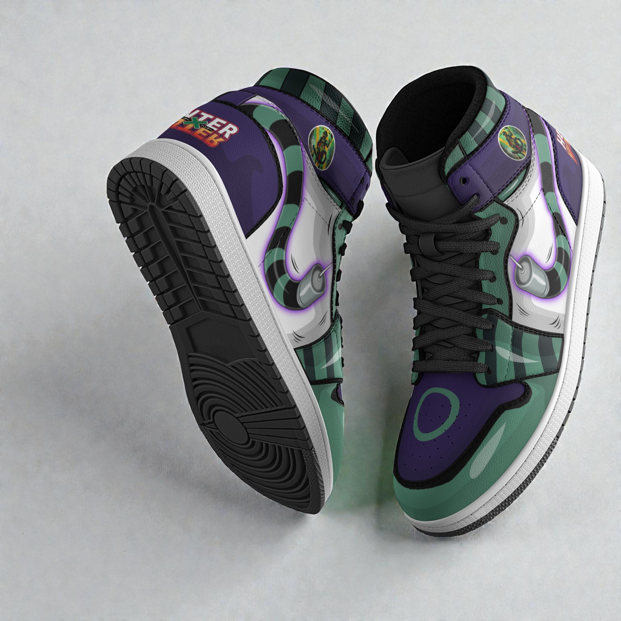 The way the purple and green color blocks collide on these kicks instantly grabs your attention—it's like the energy of Meruem himself captured in a sneaker. Those oversized graphic swooshes aren’t just decoration; they feel alive, like they could leap right off the shoe. And the character badge? A nod that only true Hunter x Hunter fans will catch, tucked perfectly among hazard-like patterns that give the whole thing a bold, streetwear edge. The bold, retro lettering on the heel adds just the right touch of nostalgia without feeling dated. If you’ve spent hours debating your favorite arcs or quotes from Hunter x Hunter, these shoes speak your language. And sneaker collectors? The mix of anime collaboration with Jordan-style sneaker boots isn’t something you see every day. It’s playful and energetic but also grounded enough for casual wear—it’s not just a display piece locked away in your closet. Whether you’re headed to a convention, a casual day out with friends, or even just want to own something that pushes your sneaker game with a story behind it, these stand out. They also make a killer gift for someone who lives at the intersection of sneaker culture and anime fandom. That blend—anime passion meets street-ready style—is exactly what the Meruem Shoes Custom Hunter x Hunter Anime Jordan Sneaker Boots bring to the table.Meruem Shoes Custom Hunter x Hunter Anime Jordan Sneaker Boots