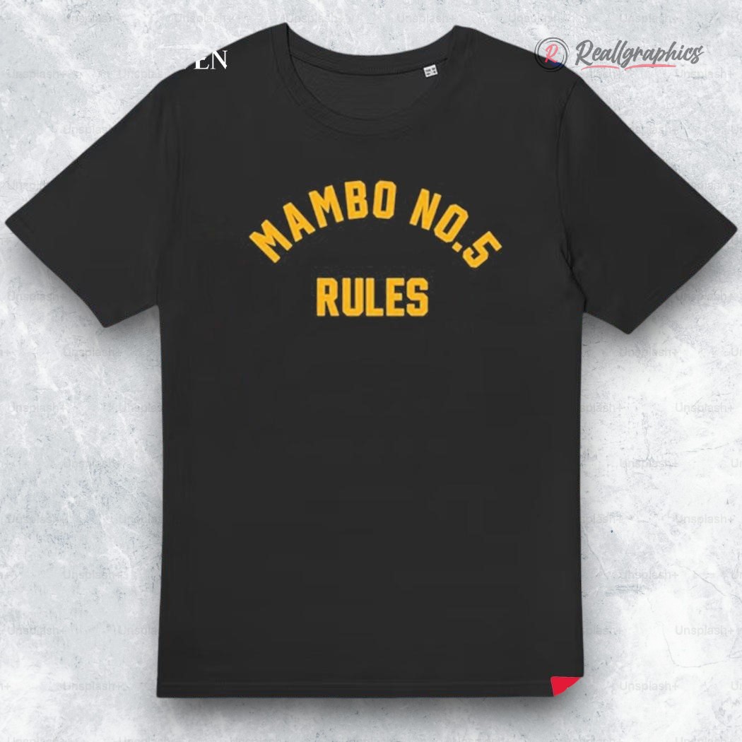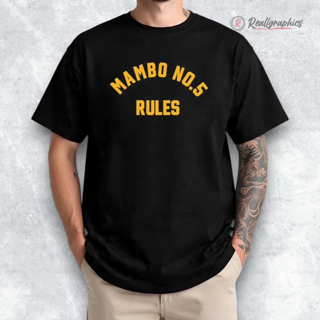 This shirt is pure fire! 🔥 A guaranteed conversation starter, this design blends quirky humor with an iconic song. Get yours now and let the world know you've got good taste and a playful spirit. 😉 Methsyndicate Mambo No 5 Rules Shirt