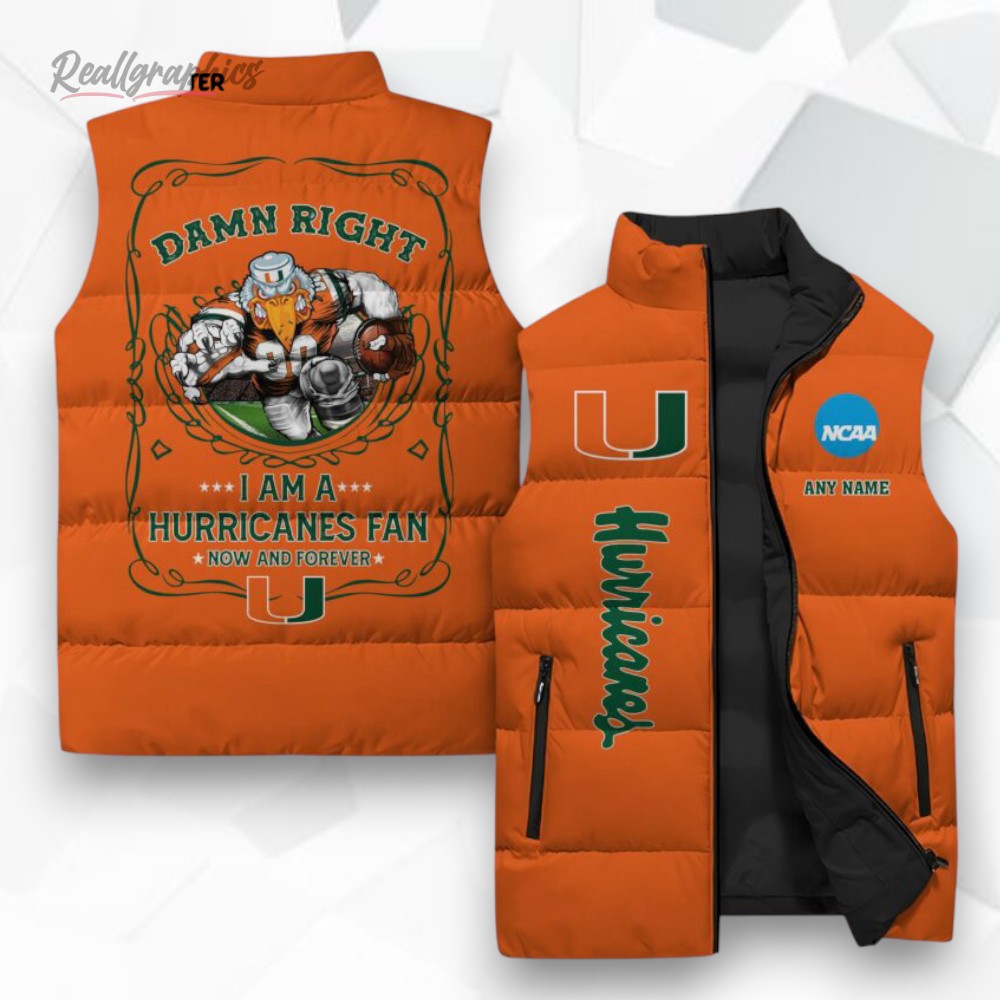 Are you a true Miami Hurricanes fan? This sleeveless puffer jacket captures that fierce spirit with an incredible design featuring the iconic mascot charging forward. The bold Damn Right I Am a Hurricanes Fan message lets everyone know your loyalty. Ready to wear your passion proudly? Grab yours now and feel the Hurricanes pride!