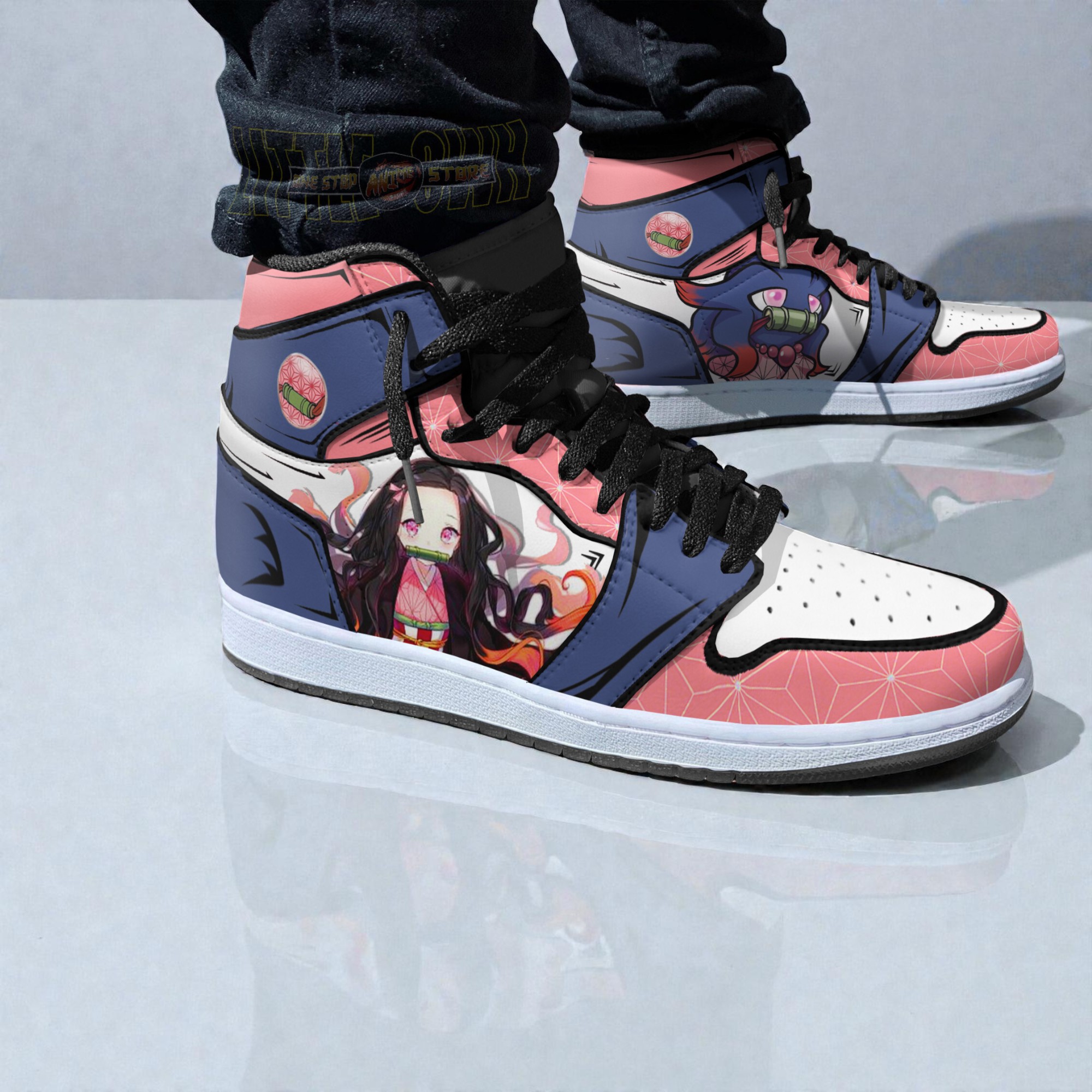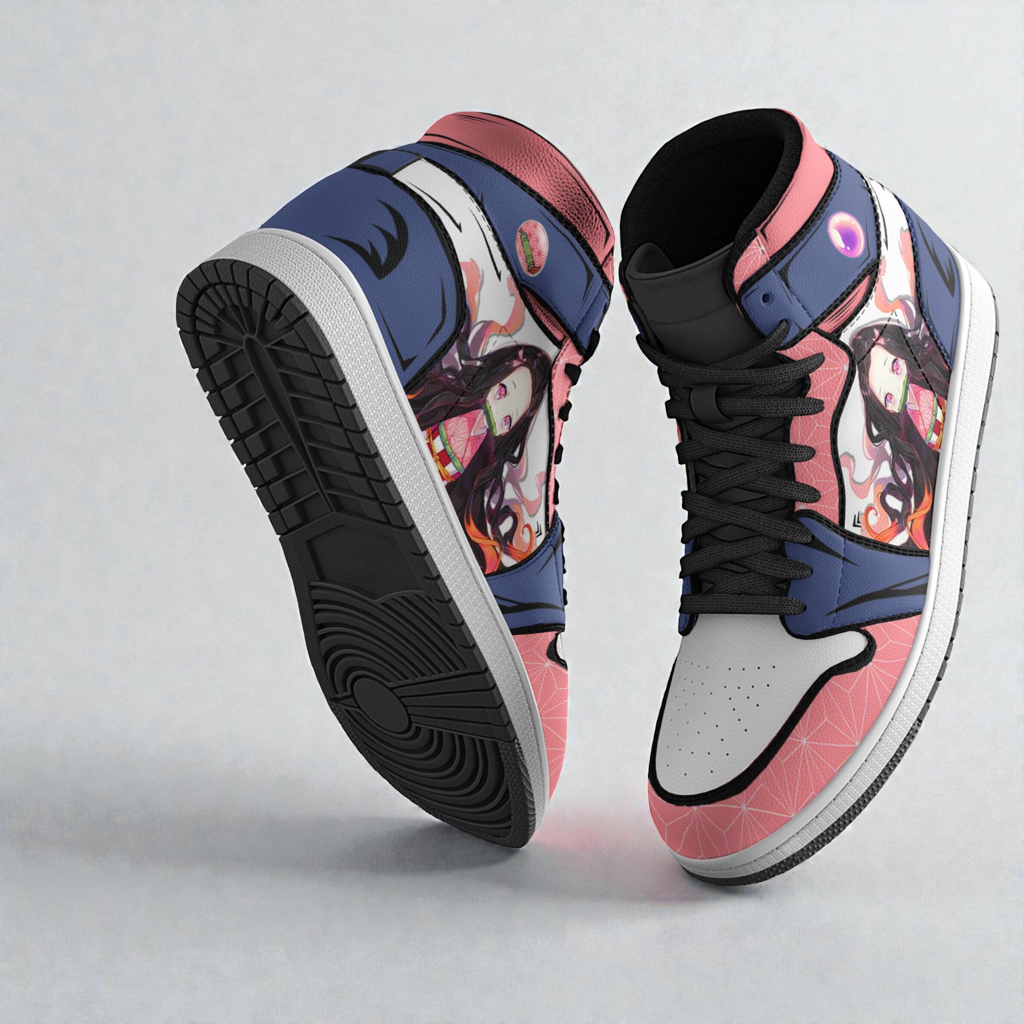 The first thing that draws your attention is the striking blend of colors and characters that cover these sneakers. A rich tapestry of deep blues contrasts sharply with vibrant pink geometric patterns, all wrapped around a sleek white toe cap. Black laces thread through, adding a grounded feel to an otherwise lively design. It’s this pop of color and layered textures that create a dynamic energy you can almost feel before putting them on. Looking closer, the artwork pays homage to two beloved worlds: Misdreavus from Pokémon and Nezuko from Kimetsu no Yaiba. The characters aren’t just slapped on; they’re integrated into the canvas, each panel telling a piece of their story. These shoes balance bold graphics with an anime art wrap that feels playful and adventurous, making them a standout piece for anyone who loves a fusion of pop-culture influences. This design naturally connects with fans who live and breathe anime, manga, or sneaker culture—or simply those who enjoy adding a little personality to their everyday footwear. It’s a subtle way to showcase your interests, whether you’re at a convention, a casual meetup, or just out and about. For sneaker collectors or anime enthusiasts looking for something unique, these anime sneakers are a lively addition that speaks to both fandom and style without feeling over the top. Perfect for everyday wear that’s anything but ordinary.