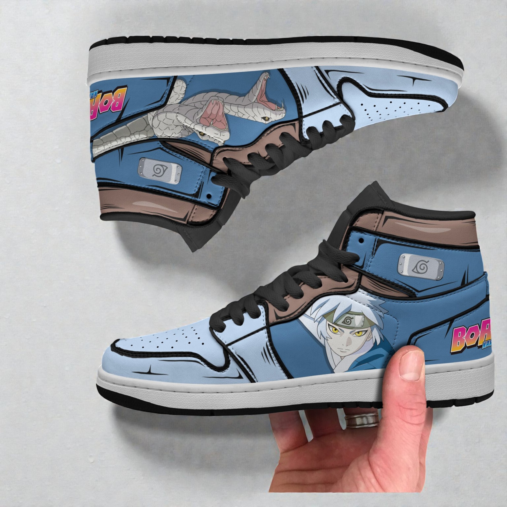 There’s something about the way these sneakers catch the eye right away—the sharp blues mixed with vivid bursts of comic-style text almost feel like they’re in motion. You can almost hear the energy from the Naruto and Boruto characters leaping off the sides, framed by action lines that give a real sense of speed and excitement. The bold illustrations are detailed but don’t overwhelm the design; instead, they create this dynamic, pop-art vibe that stands out without being too loud. Fans of the series will appreciate the attention to detail here, especially if you’ve followed Mitsuki’s story or enjoyed the broader Naruto universe. These aren’t just shoes — they’re a way to wear a bit of that adventurous spirit every day. For younger teens or anyone who loves collecting unique sneakers with a story behind them, they offer something both playful and edgy. They work well for casual outings or events where you want to bring a bit of your fandom with you—anime conventions come to mind, but they also make thoughtful gifts for anyone who’s part of the sneakerhead or anime world. The Mitsuki Anime Shoes Boruto Custom Jordan Sneaker Boots balance vibrancy with character, making them a statement that’s as much about personal style as it is about a shared passion for anime culture.