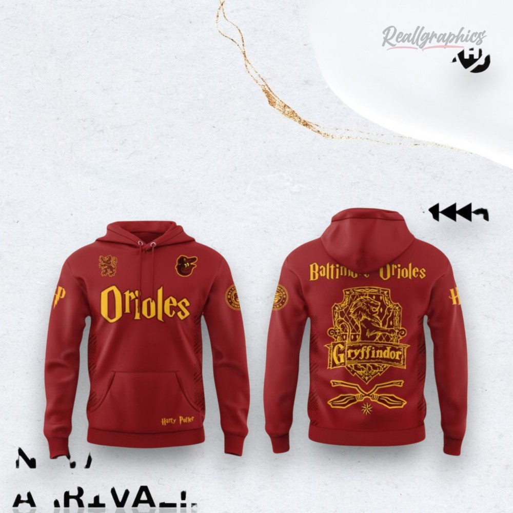 Step into a magical realm where sports meet wizardry. This hoodie showcases a striking reddish-brown design, blending Baltimore Orioles pride with enchanting Harry Potter elements. Gryffindor's iconic emblem adds a touch of bravery and adventure, while the Orioles' bold logo brings team spirit to life. Perfect for fans of both worlds, this unique 3D print makes a captivating statement.Mlb Baltimore Orioles Harry Potter Night Reddish Brown 3D Over Printed Shirt