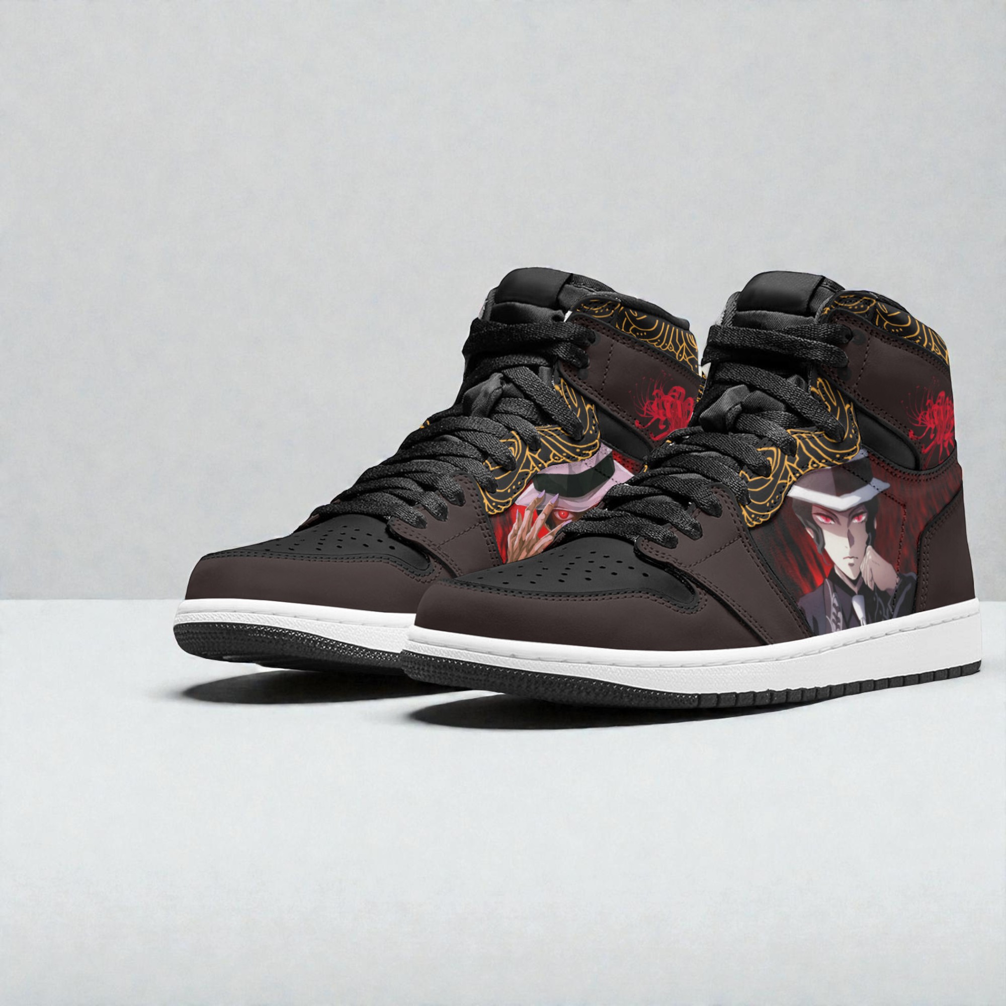 Shadows stretch across the street as the deep blacks and blood reds of these sneakers catch the eye like a whispered promise of something dangerous yet captivating. The design pulses with the intense presence of Muzan Kibutsuji, his portrait woven into the fabric with an almost eerie precision. Rich gold ornamental patterns swirl around the edges, framing the character’s menacing gaze and adding a regal yet ominous flair that demands attention. Every brushstroke and contour feels deliberate, a nod to the anime’s dark undercurrents and dramatic storytelling. These sneakers don’t just pay tribute—they embody the spirit of a character who thrives in the shadows, blending bold streetwear with cosplay-ready craftsmanship. For those who know the story, slipping into this footwear is a way to carry a piece of that world with them—intense, energetic, unapologetic. They speak to the wearer’s connection with the thrill of battles fought in silence and the elegance of a villain who commands both fear and fascination. Collectors and anime enthusiasts alike will appreciate how these sneakers step beyond typical fan merchandise; they’re a statement of identity, a merging of everyday style with passionate fandom. Whether worn casually or to a convention, they quietly declare allegiance to the characters and narratives that resonate deeply, making each stride more than just a step. These Muzan Kibutsuji sneakers aren’t merely footwear—they’re a doorway into a shared passion and culture.