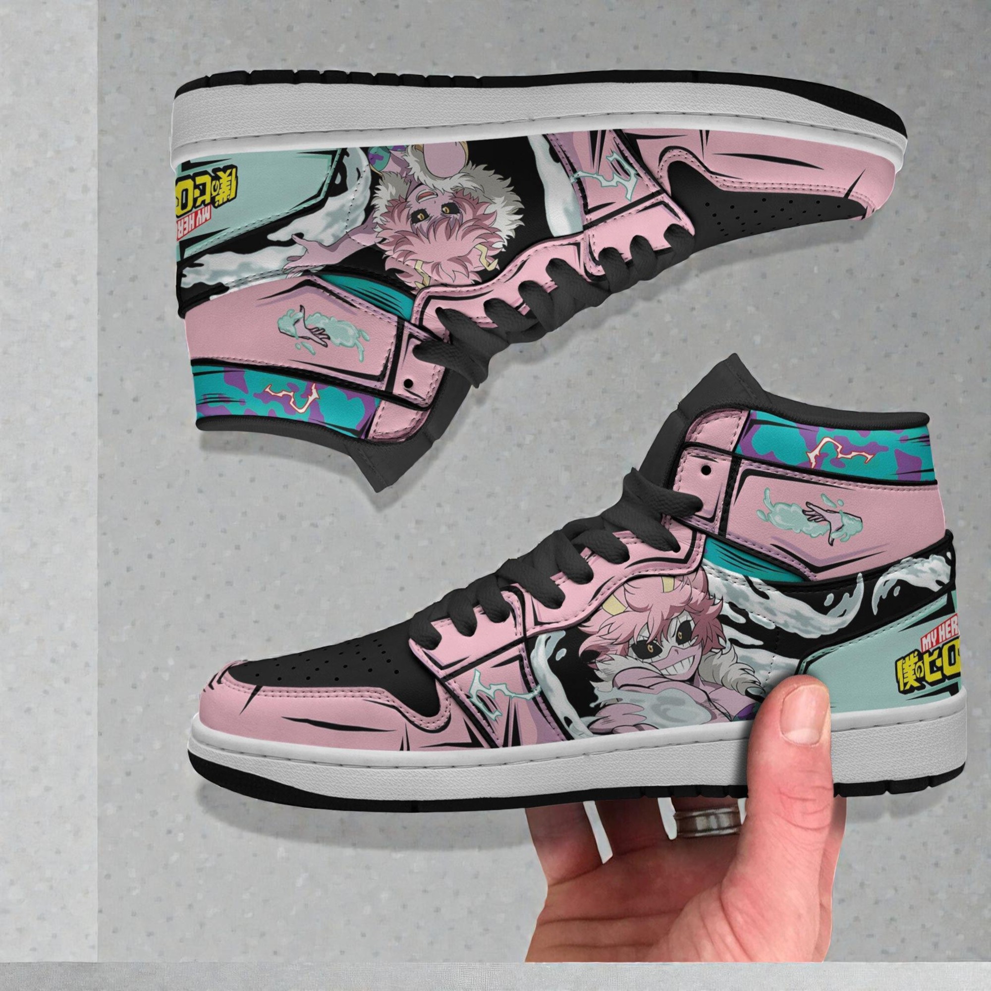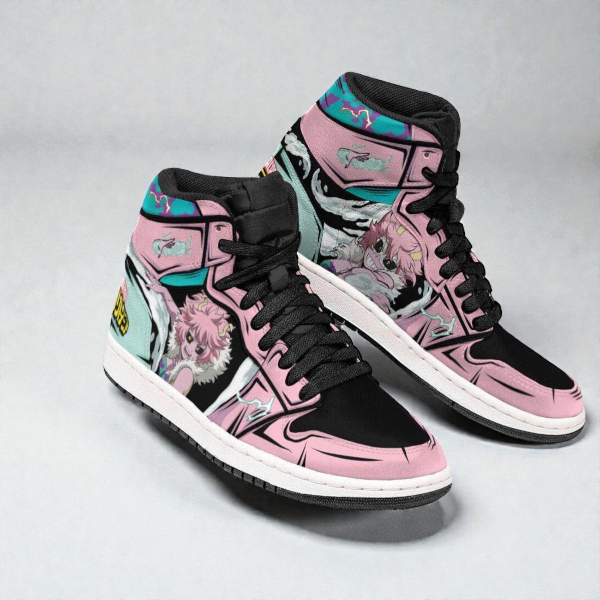 Bright pastel pinks and teal hues clash playfully across the sturdy silhouette of these sneakers, each step echoing the bold energy of Mina Ashido’s rebellious spirit. Comic-style panels frame sharp black outlines, while bursts of Japanese kanji and graphic fonts add a pop-art punch, transforming the familiar sneaker into a moving storyboard. It’s the kind of design that feels alive, like the wearer is carrying a piece of an animated world beyond the screen. This isn’t just about fandom. It’s for those who live loud, who know that style can be both vibrant and unapologetic. Someone who mixes casual streetwear with splashes of eccentricity, effortlessly pairing these shoes with denim or a laid-back athleisure look. Or maybe they’re the cosplayer who wants a little everyday flair that echoes their favorite hero’s vibe without stepping into full costume territory. Any collector or die-hard anime fan drawn to My Hero Academia sneakers will find this design a meaningful extension of their passion. The shoes become a quiet conversation starter at conventions or a playful highlight for casual days out. Gifting these sneakers says something about knowing someone’s bold tastes, their connection to animation’s color-driven energy, and their love for characters who break the mold.