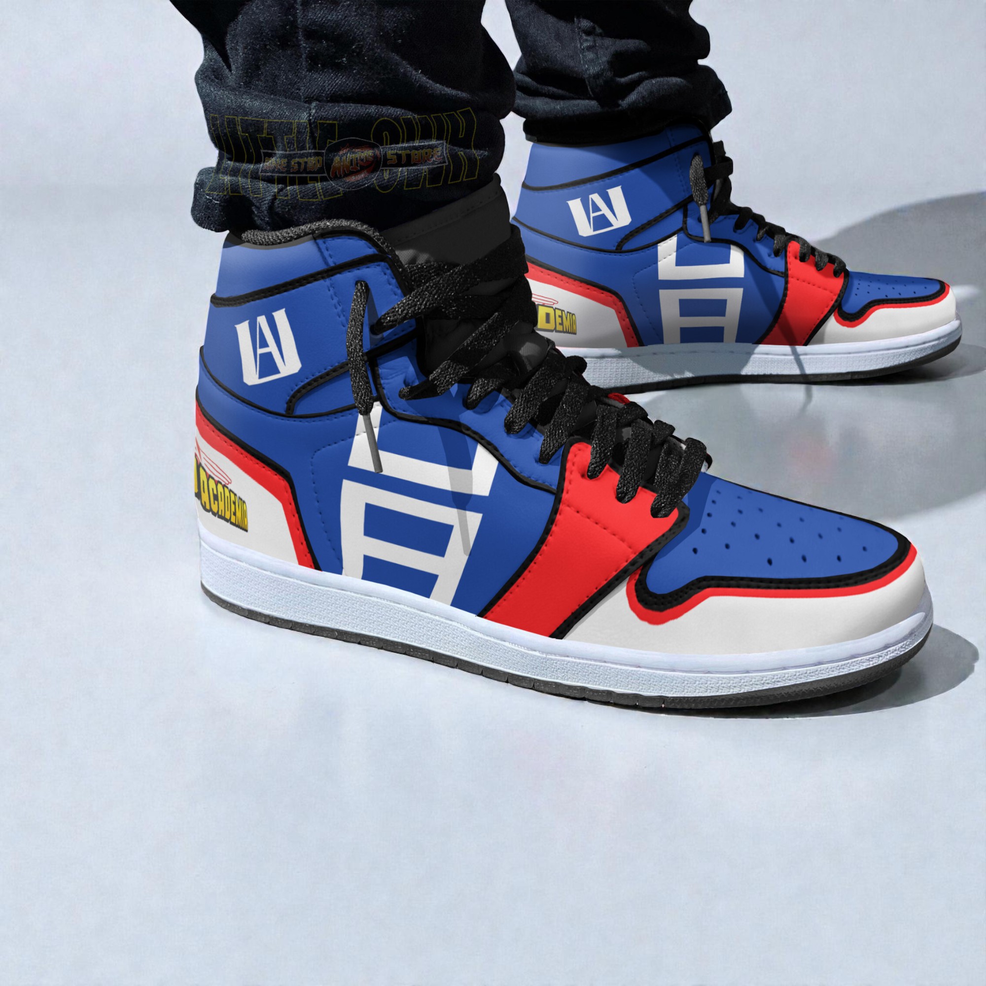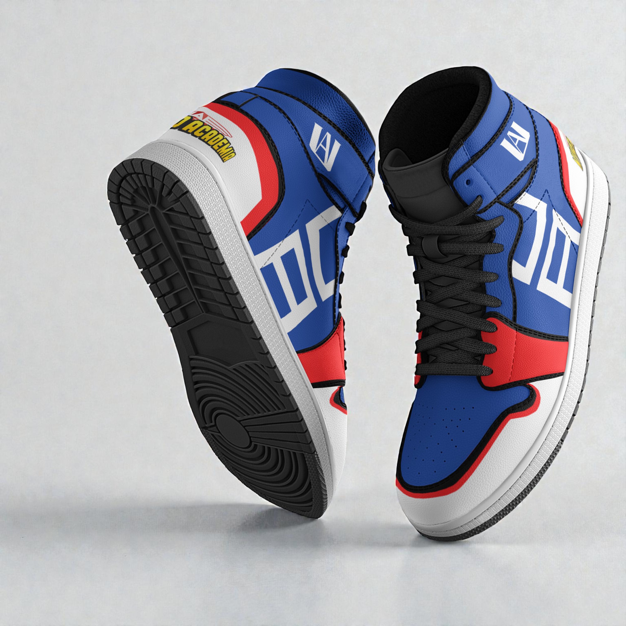 The bold blocks of blue, red, and white come together on the sneakers in sharp, angular shapes that almost feel like comic book panels frozen in motion. Oversized letters and graphic motifs add to the visual punch, combining athletic energy with a distinctly anime-inspired edge. These shoes look at home both on the convention floor and paired with casual streetwear, carrying the same adventurous spirit that fuels cosplay. They don’t just function as footwear; they express a connection to a world where heroes stand out and individuality is part of the story. Someone who embraces the colorful energy of My Hero Academia or simply enjoys sneakers that catch the eye would find these a natural extension of their personality. They fit seamlessly into a day where fandom meets real life—like walking through city streets or meeting up with friends who appreciate detail and design as much as performance. These are shoes made for people who want their style to say more than just “comfortable” or “functional.” They carry the bold, graphic enthusiasm of anime, but with a grounded, sporty foundation. The My Hero Academia Uniform Cosplay Shoes Anime Jordan Sneaker Boots tap into a playful confidence, perfect for those who see their wardrobe as a personal canvas and don’t shy away from a little flair.My Hero Academia Uniform Cosplay Shoes Anime Jordan Sneaker Boots