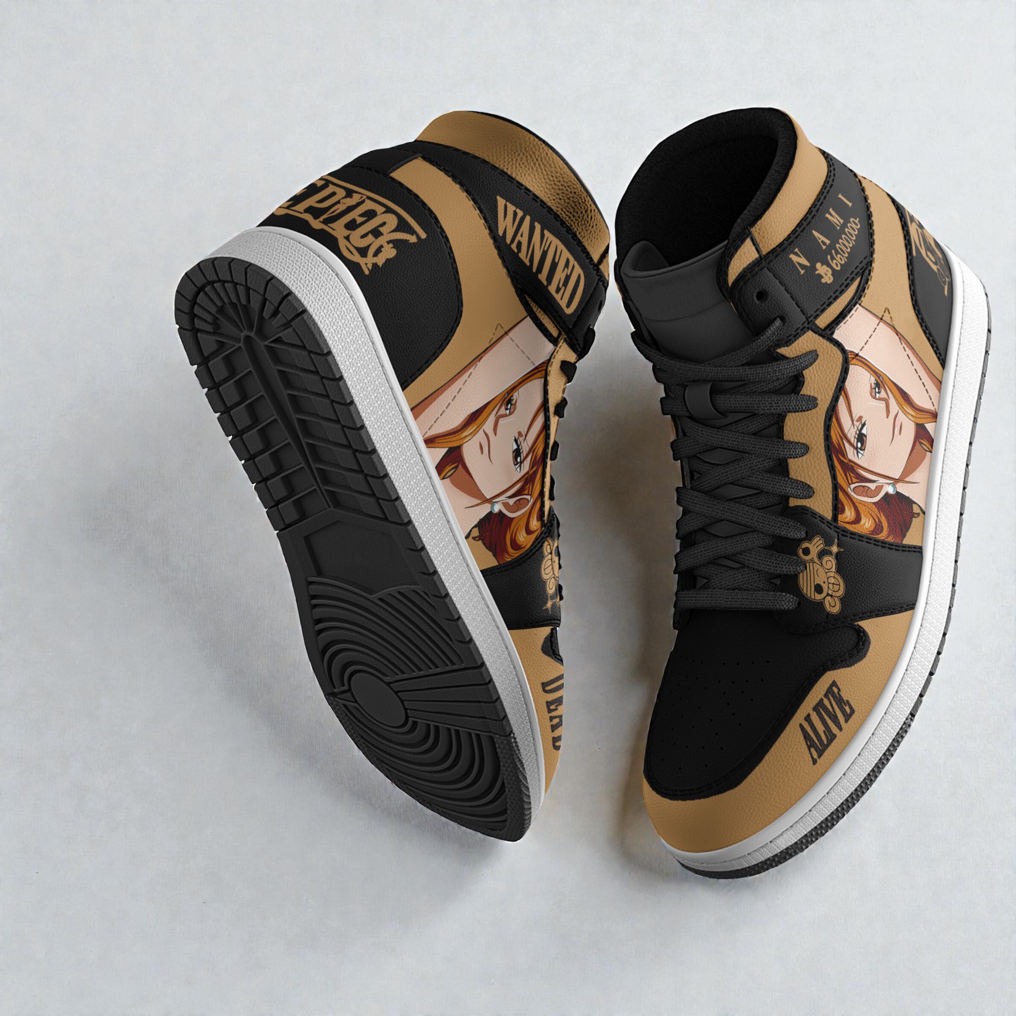 The splash of burnt orange alongside crisp black on these custom Jordan sneaker boots calls to mind the vivid energy and rebellious spirit of a wanted poster fluttering in the salty breeze of a pirate’s hideout. The bold imagery of Nami, sketched with sharp lines and vibrant contrast, captures her cunning intelligence and fierce independence—traits that resonate far beyond the screen. Layout-wise, the graphics flow organically across the sides, blending the iconic “Wanted” emblem with subtle maritime motifs that hint at adventure without overwhelming the design. These shoes speak most clearly to those who wear their fandom as a statement, who see style as a form of storytelling. For someone who navigates their world with the same sharp wit and confidence as the navigator herself, this design becomes more than decoration—it’s a subtle badge of identity. Whether wandering city streets or attending a casual meet-up, the balance of sneaker comfort and boot silhouette offers an edge that’s both practical and expressive. Gifting this kind of footwear isn’t just about the aesthetic; it’s a nod to shared passion, a quiet acknowledgment of what shapes a person’s sense of self. The Nami Wanted custom Jordan sneaker boots One Piece anime shoes stand at the intersection of culture and personality, created for those who refuse to blend into the background.