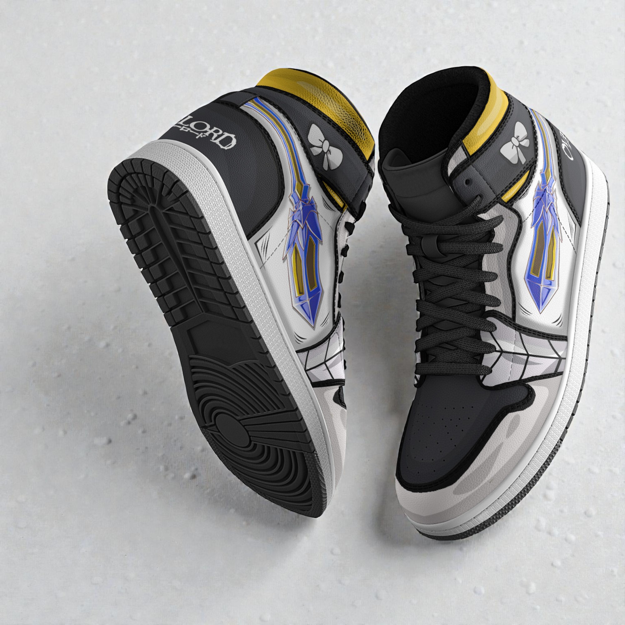 Sharp angles slice through a backdrop of deep black, punctuated by bursts of white, yellow, and electric blue that radiate energy with every step. Bold graphic motifs echo the striking silhouette of Narberal Gamma, with bow-like shapes and dynamic stripes that recall the character’s fierce elegance. The typography references anime and manga styles—a powerful, label-like font crisply printed along the sides anchors the design in its source material while adding an unmistakably urban edge. These shoes don’t just look like something out of a cosplay closet; they wear the spirit of a fandom that thrives on bold expression and storytelling through style. For those who recognize the emblem or feel a connection to Overlord’s world, the sneakers signify more than just footwear—they’re a nod to shared passion and identity. The mix of streetwear swagger and anime art elevates the everyday look, inviting wearers to channel a heroic vibe without stepping onto a convention floor. Narberal Gamma sneakers sit at a unique intersection of culture—where cosplay authenticity meets streetwise creativity. Whether someone’s heading to a convention or strolling around town, these boots bring that same confident energy, making fandom visible in daily life. For collectors, enthusiasts, or anyone with a taste for narratives woven into what they wear, these sneakers fit into routines just as easily as they do into conversations.Narberal Gamma Custom 3D Shoes Overlord Anime Cosplay Jordan Sneaker Boots