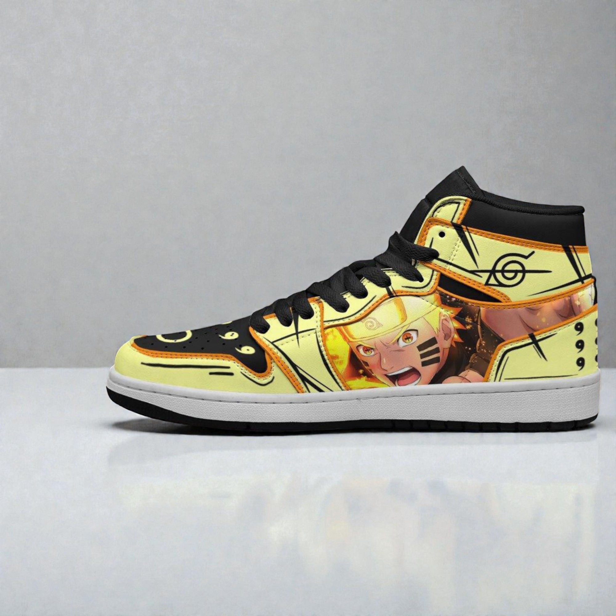 A burst of vibrant yellow catches the eye immediately, serving as the perfect canvas for the bold Naruto artwork that claims these sneaker boots as something more than just footwear. Inspired by the Sage of the Six Paths, these shoes carry the weight of one of the anime’s most powerful and legendary figures, whose intensity and wisdom ripple through every brushstroke and pattern. Black laces and paneling contrast sharply against the bright base, anchoring the design with a grounded edge that echoes the character’s balance of strength and calm. Kanji-like markings run across the sides, reminiscent of ancient seals and symbols from the anime’s universe — subtle but unmistakable nods to fans who know the deeper meanings embedded in the story. The symbolic headband emblem is a standout detail, almost like a badge of honor worn proudly by those who see themselves connected to Naruto’s journey—whether through fandom or a shared sense of resilience and growth. Crafted with care, the sneaker boots combine streetwear aesthetics and anime artistry seamlessly. The design feels energetic and urban but maintains a precision that suggests a sneaker collector’s dream. It’s not just about looking cool; it’s about celebrating a legacy through well-executed style. For anime enthusiasts who appreciate bold visual statements or anyone seeking standout pieces for conventions or casual settings, these Naruto sneaker boots bridge passion and craftsmanship perfectly. This pair is an ideal gift for those who can’t get enough of Naruto’s world, offering more than just footwear—it’s a wearable tribute to one of anime’s most enduring icons.Naruto Jordan Sneaker Boots Custom Sage of The Six Paths Mode Anime Shoes