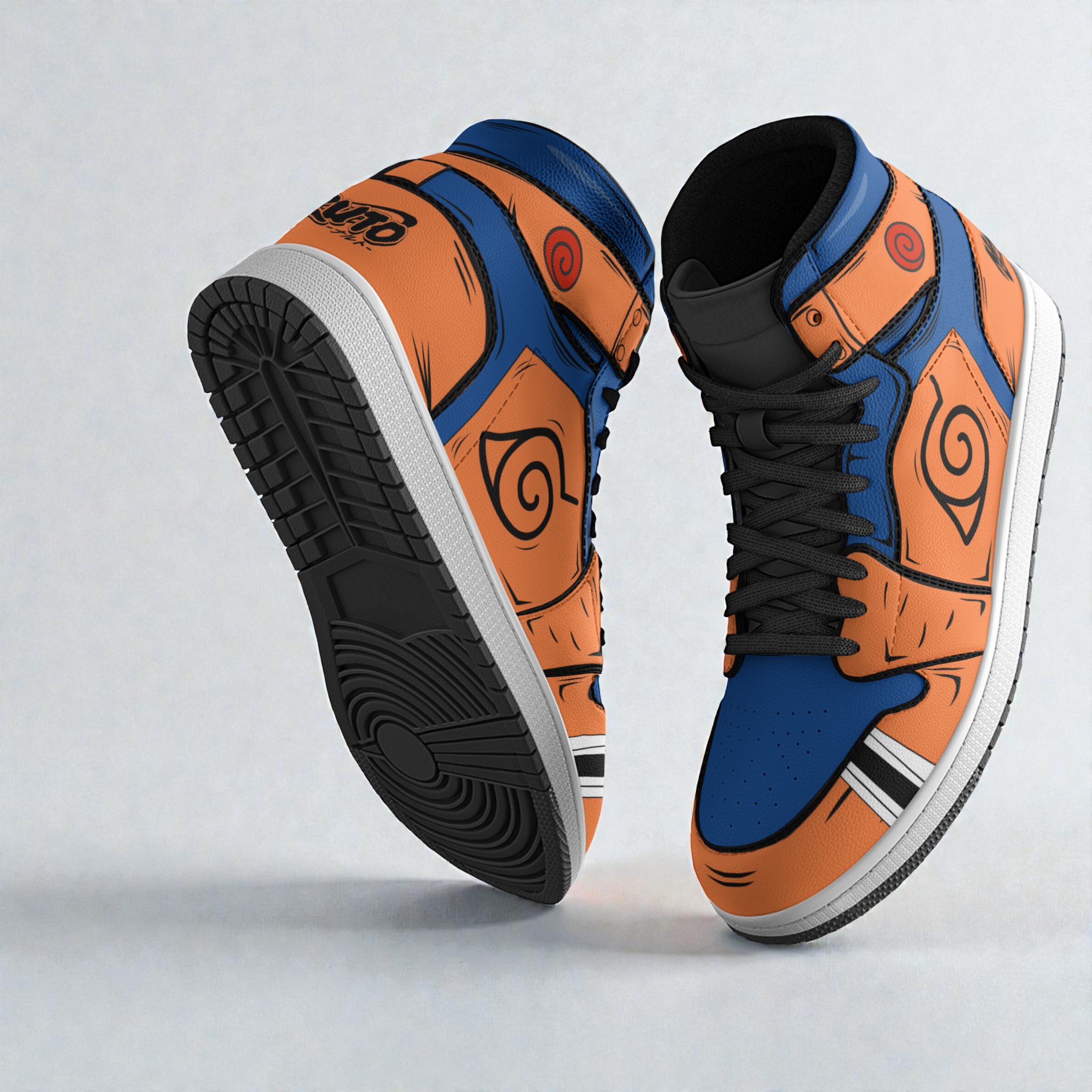 Bright swaths of orange burst against deep blue panels, immediately catching the eye with their vibrant contrast. The sneaker boots feature bold spirals reminiscent of Naruto Uzumaki's signature symbol, twisting playfully along the sides. Crisp white midsoles ground the design while black laces weave a stark frame that brings the whole look into sharp focus without overwhelming it. This pairing of energetic colors and iconic graphic elements mirrors the dynamic personality of any true Naruto fan. These Naruto inspired sneakers speak to more than just style—they’re about embodying a fandom that’s as passionate as it is adventurous. The subtle nods to the anime's aesthetic make these shoes more than cosplay accessories; they become a way to wear your enthusiasm on your feet, blending streetwear flair with recognizable character themes. Ideal for anime enthusiasts who want everyday footwear with a punch of personality, or cosplay lovers seeking that perfect touch of authenticity, the design feels both playful and intentional. Whether strolling through a convention hall or adding an unexpected twist to casual outfits, they carry an energy that resonates with those who appreciate graphic storytelling and vibrant culture. As a gift, these sneakers naturally stand out—functional yet spirited, ready to accompany countless fandom moments. Their boldness invites connection, sparking conversations wherever they go. For anyone chasing sneakers that capture the heart of Naruto's world, this style hits that balance between iconography and street-ready swagger.