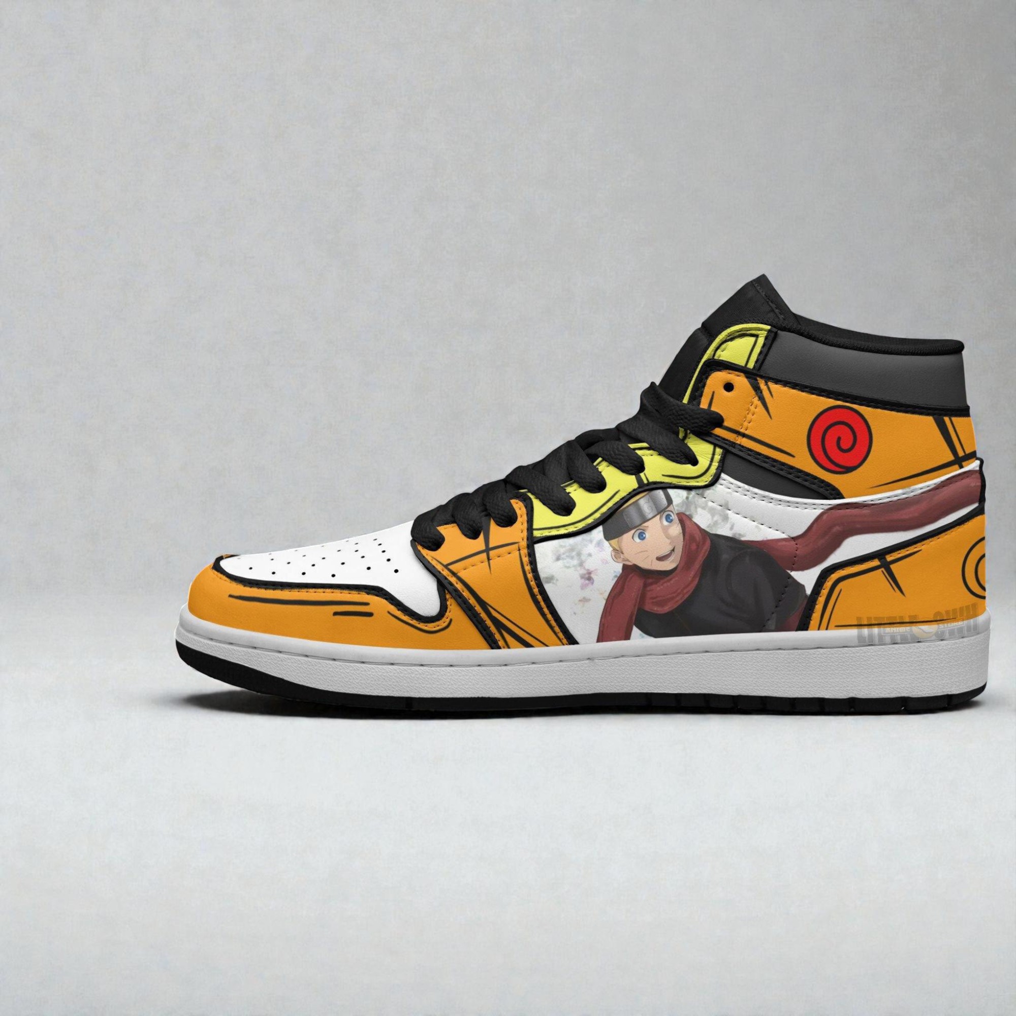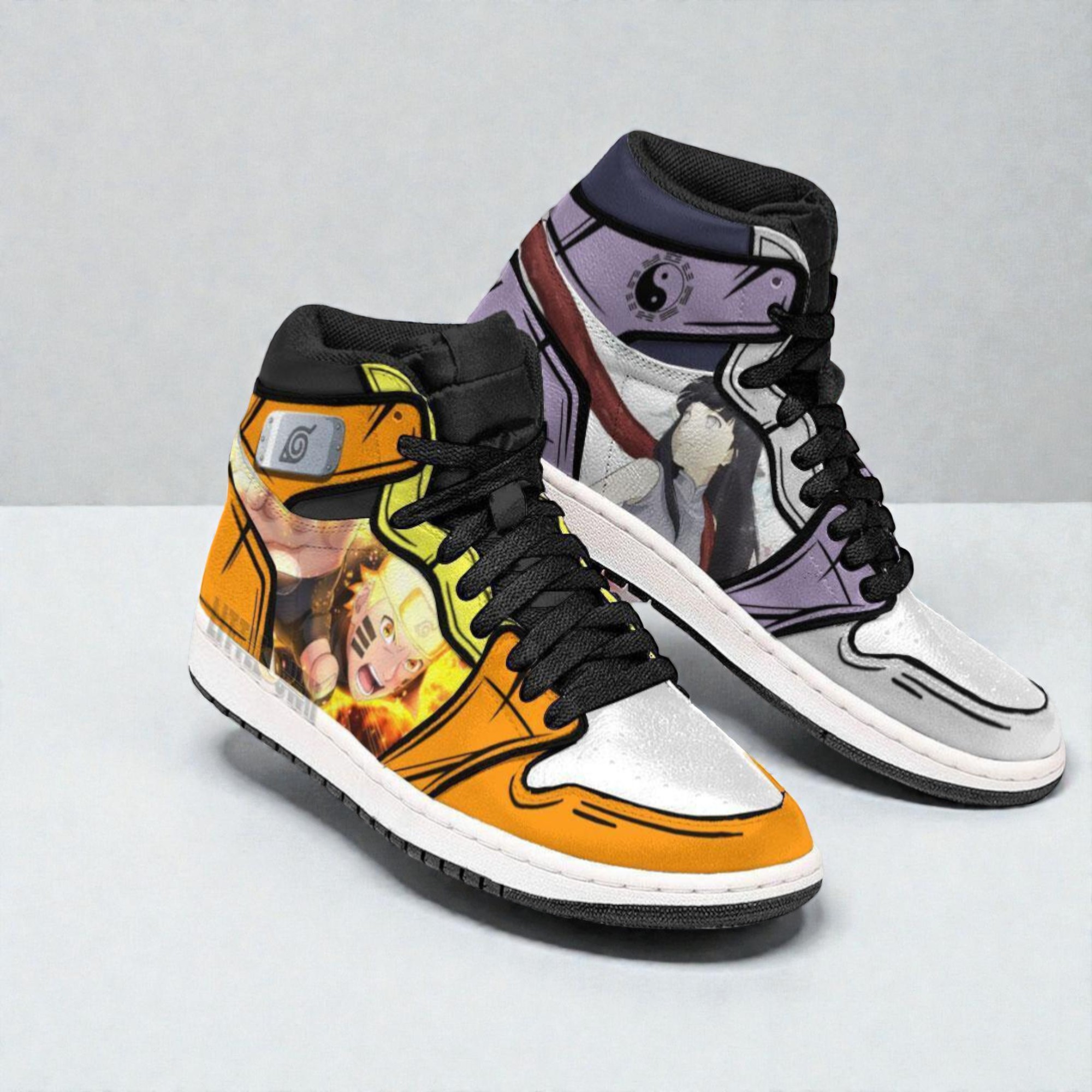 There’s something about lacing up a pair of shoes that tell a story beyond just fashion. These Naruto sneaker boots catch your eye instantly—the way the bold orange, white, and black collide with flashes of yellow is hard to ignore. The high-top silhouette carries a strong presence, like the kind of confidence you find in your favorite anime moments. Look closer, and the details start to speak volumes: subtle Naruto symbols woven into the design, a striking graphic of Naruto and Hinata that pulls you right into their world. It’s not just about the colors or patterns, but the energy they bring, the way they channel that adventurous spirit fans know so well. For anyone who lives and breathes Naruto, these boots are a perfect extension of that fandom. Sneaker collectors who appreciate vibrant, character-driven styles will find these a conversation starter, while anime enthusiasts might see them as a wearable tribute to one of the most beloved crossovers in the series. They don’t just stand on a shelf—they carry you through daily adventures, casual outings, or convention floors, blending style with a nod to passion. Whether you're looking for something to gift a fan or just want to rock something that zings with personality, this pair is more than footwear; it’s a statement. A dynamic blend of art and energy made for those who want their steps to mean something.Naruto x Hinata Jordan Sneaker Boots Custom Naruto Anime Shoes