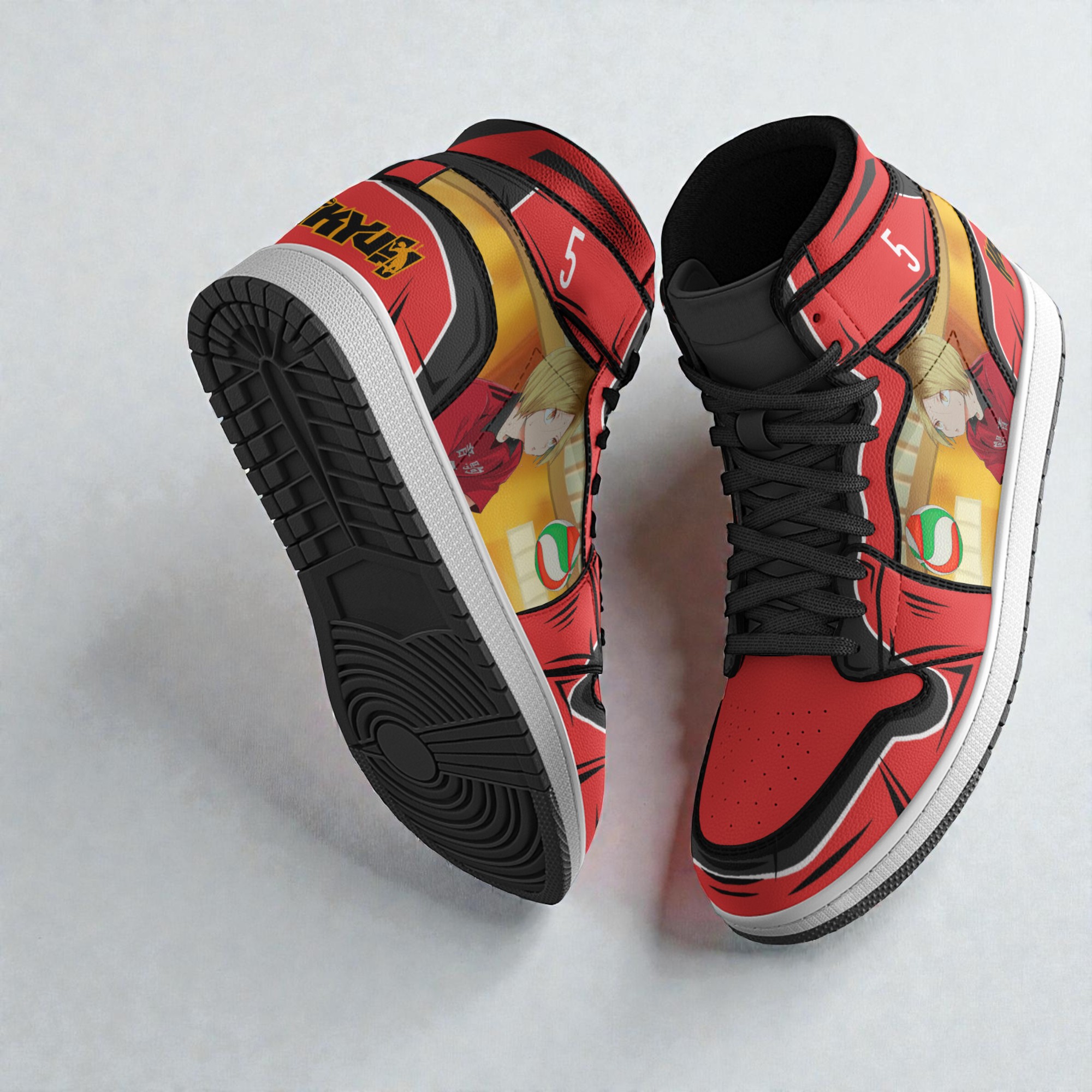 A pair of sneakers can say a lot about who you are, whether you’re navigating the city streets or heading to a laid-back gathering. These Nekoma High Haikyuu boot sneakers carry more than just color—they carry attitude. The dominant red base pulses with energy, framed by sharp black outlines that trace bold geometric panels, giving the shoes a crisp, athletic edge. On each side, anime character panels bring Kenma Kozume to life, his presence subtle but unmistakeable for those familiar with the series. Accents of soaring volleyball imagery and the blocky number 5 stitch into the design, echoing themes of teamwork and competition. The white midsole offers a clean contrast, grounding the vivid hues and busy visuals with a fresh simplicity. These sneakers don’t just look dynamic—they feel like a statement about belonging to a community that values both style and passion. Wearing a pair like this naturally aligns with someone who appreciates the layers behind their wardrobe—a Haikyuu fan, sure, but also anyone drawn to items that blend playfulness with sportiness. It’s a discreet nod in a cosplay line, or an everyday expression of the energy that anime and athletics bring into life. They serve well as a thoughtful gift, too, for those who cherish the intersection of pop culture and personal style without drifting into loud or clichéd territory. The Nekoma High Haikyuu boot sneakers capture that balance smoothly, striding confidently between fandom and fashion.