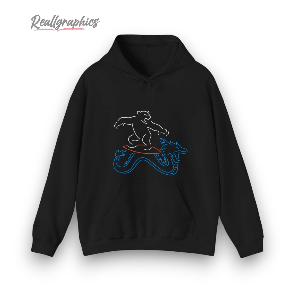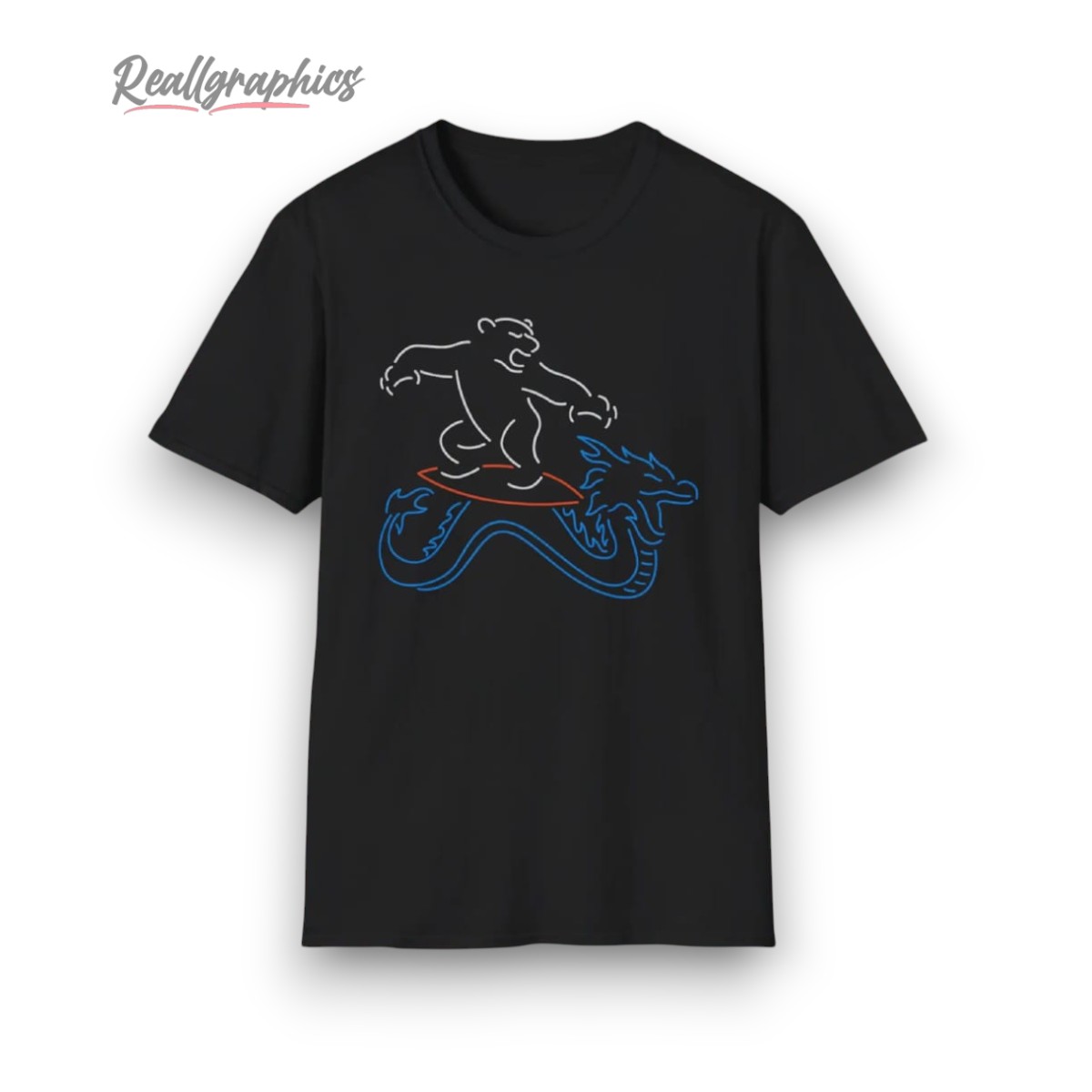 Ride the waves with an electrifying polar bear mastering a neon-lit surfboard atop a mystical blue dragon. This eye-catching design infuses adventure with a touch of fantasy, perfect for surf enthusiasts and dreamers alike. Illuminate your style with this dynamic and vibrant print, guaranteed to turn heads.Neon Surfing Polar Bear Shirt