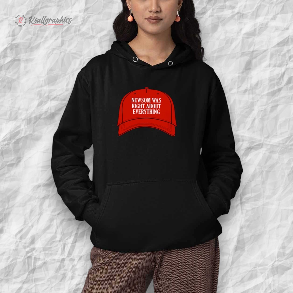 This sweatshirt flips the script on the most recognizable symbol in modern politics. It features a graphic of the iconic red baseball cap, but instead of the usual slogan, it bears the bold white declaration: "NEWSOM WAS RIGHT ABOUT EVERYTHING".