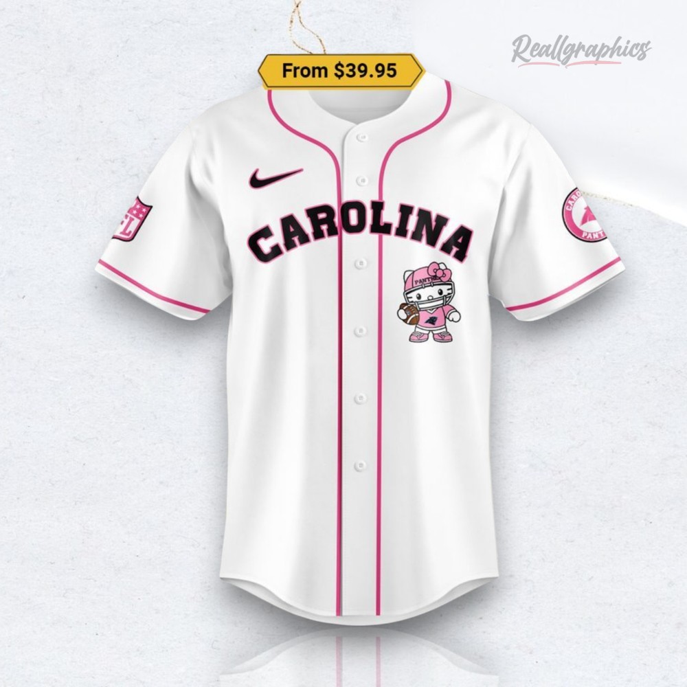 Show your Panther pride with this adorable Hello Kitty baseball jersey! Perfect blend of sporty and cute, featuring the iconic team colors on a classic white design. A must-have for any fan who loves the Panthers and Hello Kitty! Get yours now and cheer on your team in style.