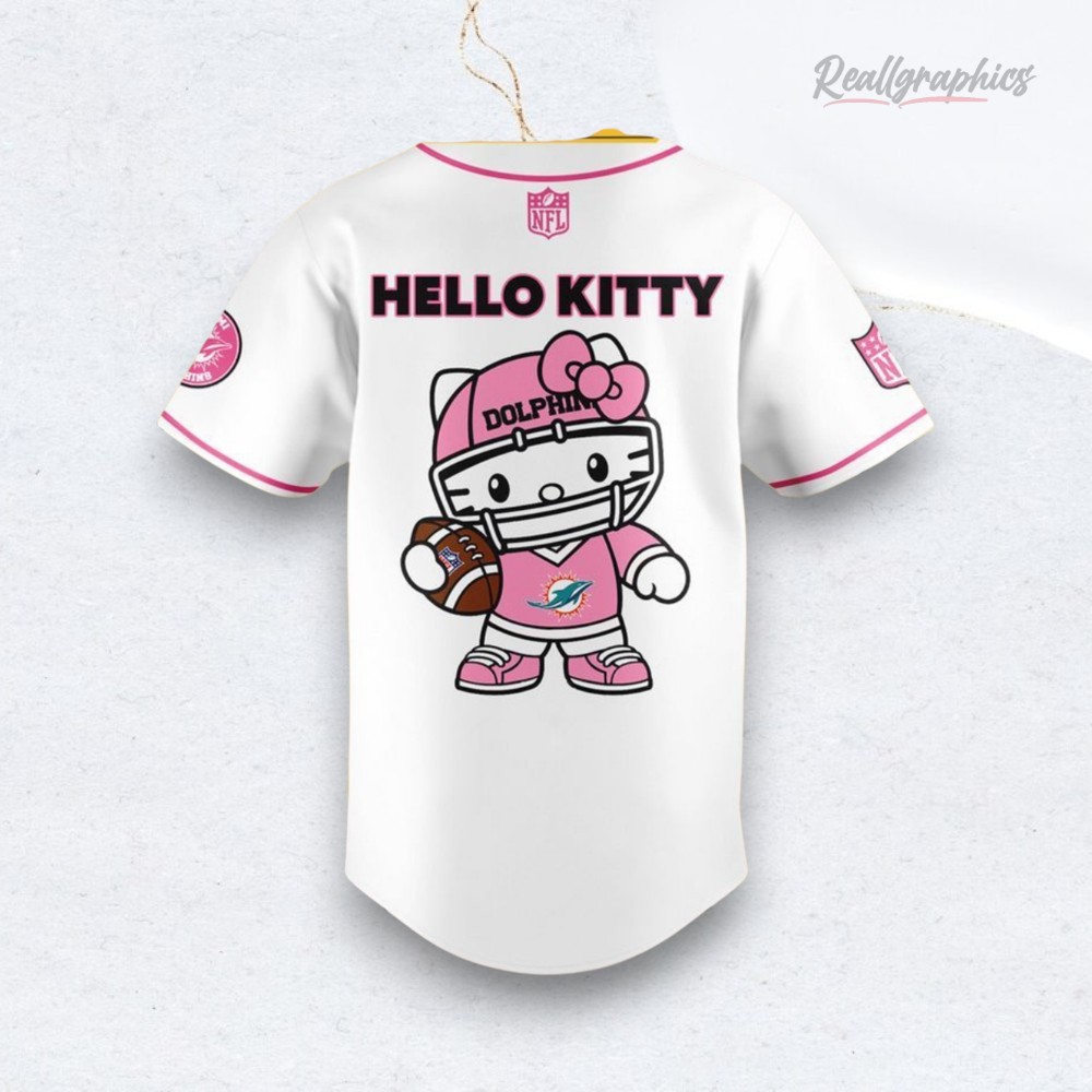 Show your Miami Dolphin pride with this adorable Hello Kitty baseball jersey! The perfect blend of sporty and sweet, this white jersey is a must-have for any fan. Get yours today and cheer on the Dolphins in style! Limited quantities available.