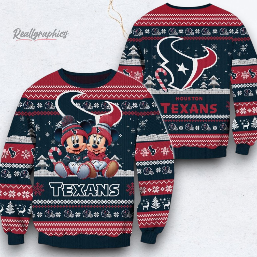 Show off your team spirit this holiday season! This festive sweater featuring everyone's favorite Disney duo is the perfect way to celebrate Christmas and support your Texans. Get yours now before they're gone! Limited edition, so don't miss out! #Texans #Christmas NFL Houston Texans Mickey Minnie Limited Ugly Christmas Sweater