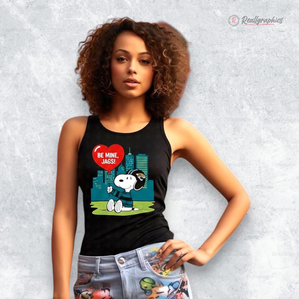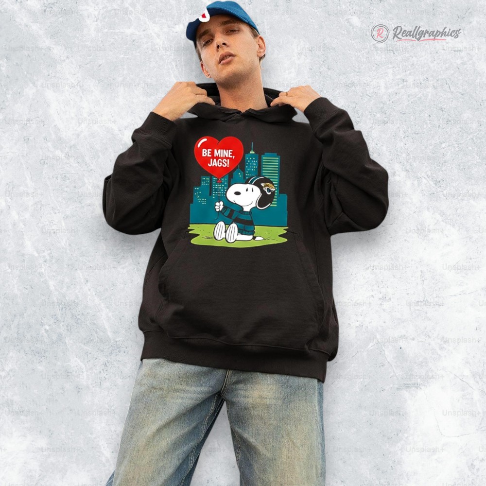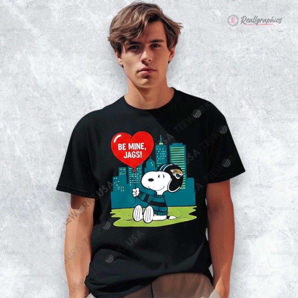 This charming design features Snoopy holding a heart balloon that reads “Be Mine, Jags!”, set against a city skyline and finished in iconic Jaguars colors. It’s fun, heartfelt, and perfect for Valentine’s Day or everyday fan wear.