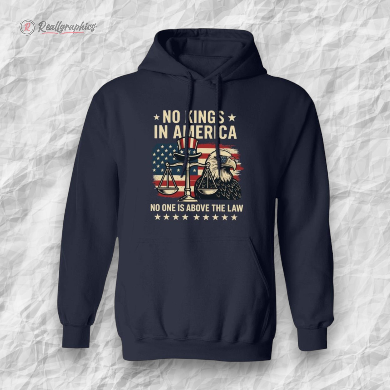 The design immediately grabs attention with its bold, vintage Americana aesthetic. Against a backdrop of a weathered American flag, the message “No Kings In America No One Is Above The Law” is presented in a strong blend of distressed serif and sans serif fonts, all capitalized for emphasis. The typography feels rugged yet deliberate, conveying a sense of defiance that matches the overall theme. A prominent bald eagle—sharp-eyed and poised—perches near the scales of justice, adding to the visual narrative of legal fairness and patriotic pride. This hoodie speaks to a particular mindset, one that values accountability and isn’t afraid to poke fun at the idea of unchecked power. It fits someone who follows political discourse, appreciates clever satire centered around law and justice, and wears their convictions with a bit of an edge. It’s less about subtlety and more about making a clear, confident statement without saying a word. For anyone attending a rally, political event, or just spending a weekend around friends who enjoy spirited debates, this piece fits right in. It doubles as a conversation starter and a standout casual layer that carries a punchy message. A thoughtful gift for those who enjoy combining humor with patriotism, this hoodie captures a timeless attitude: that nobody stands above the law. The No Kings In America No One Is Above The Law shirt offers striking graphics paired with a meaningful, rugged vibe.No Kings In America No One Is Above The Law Shirt