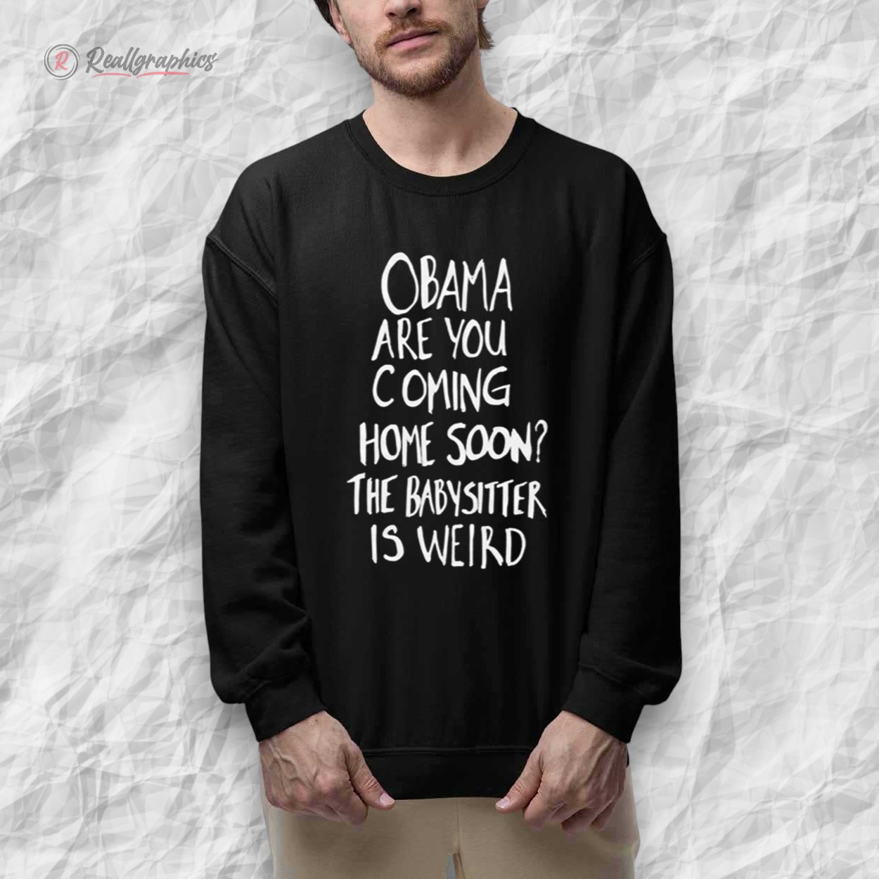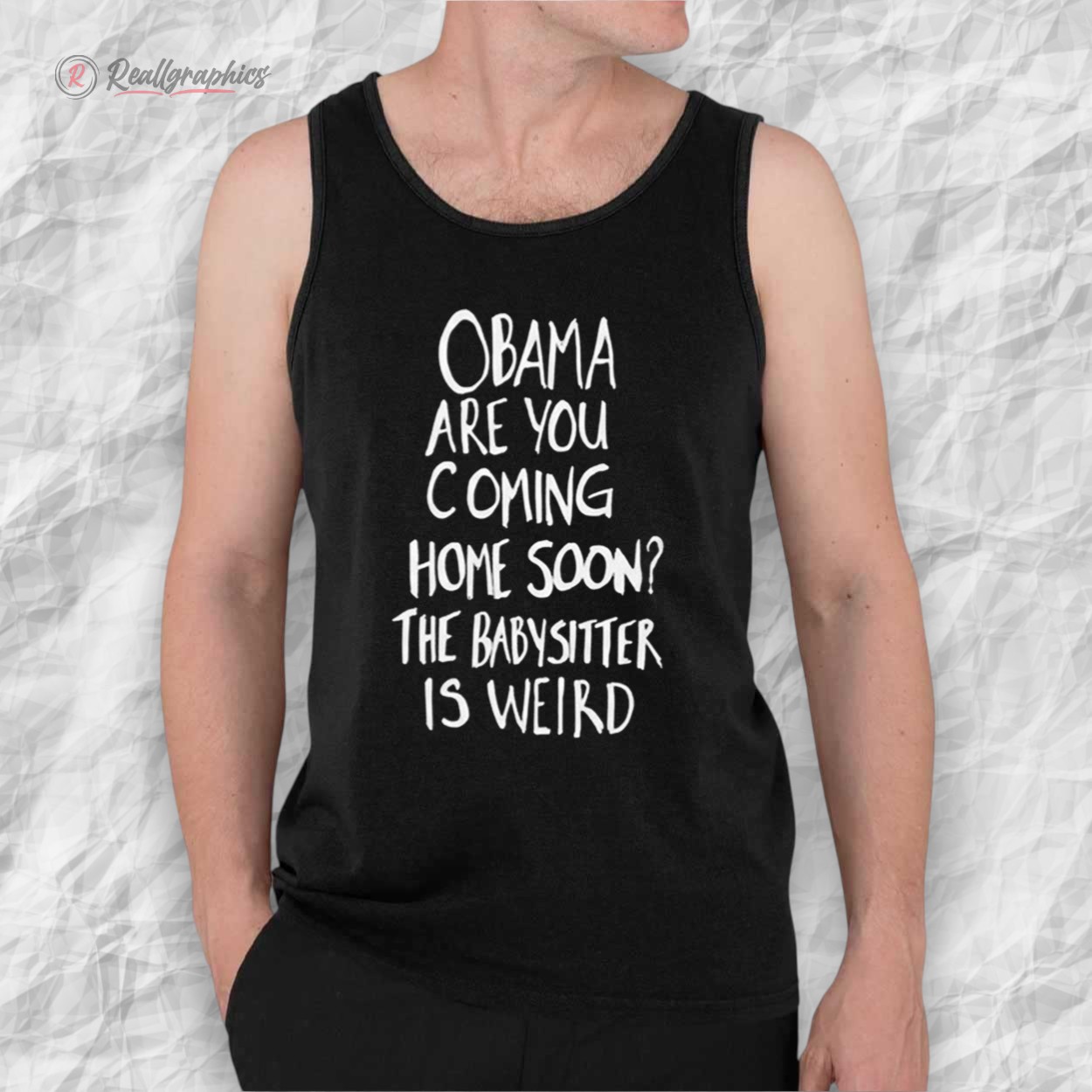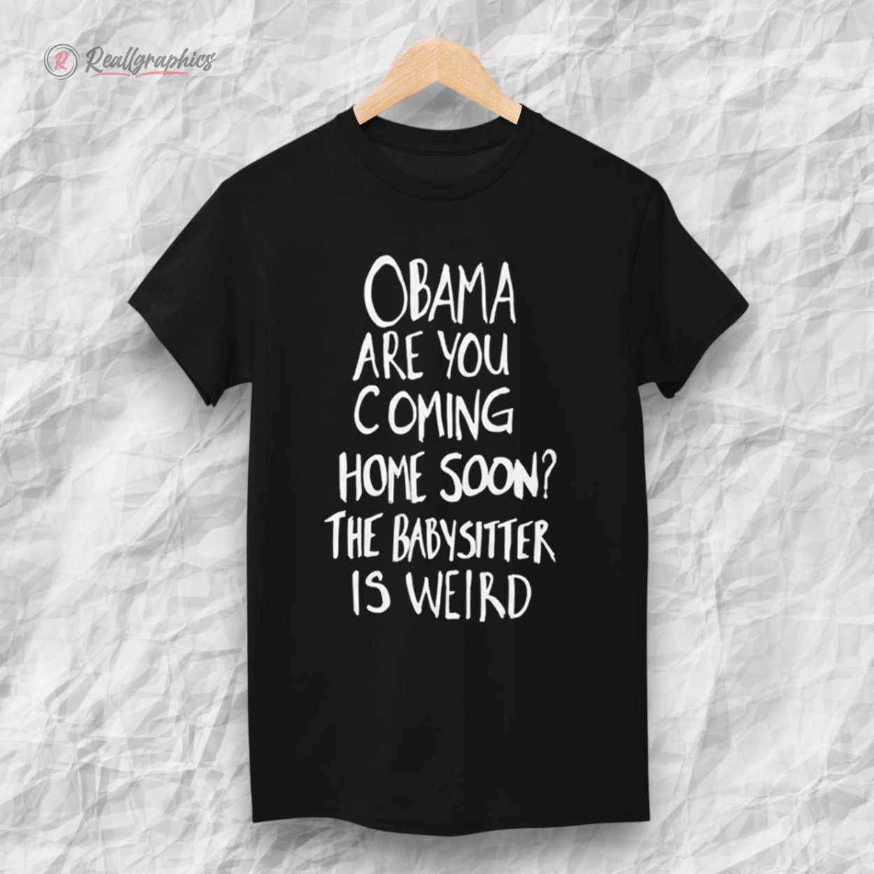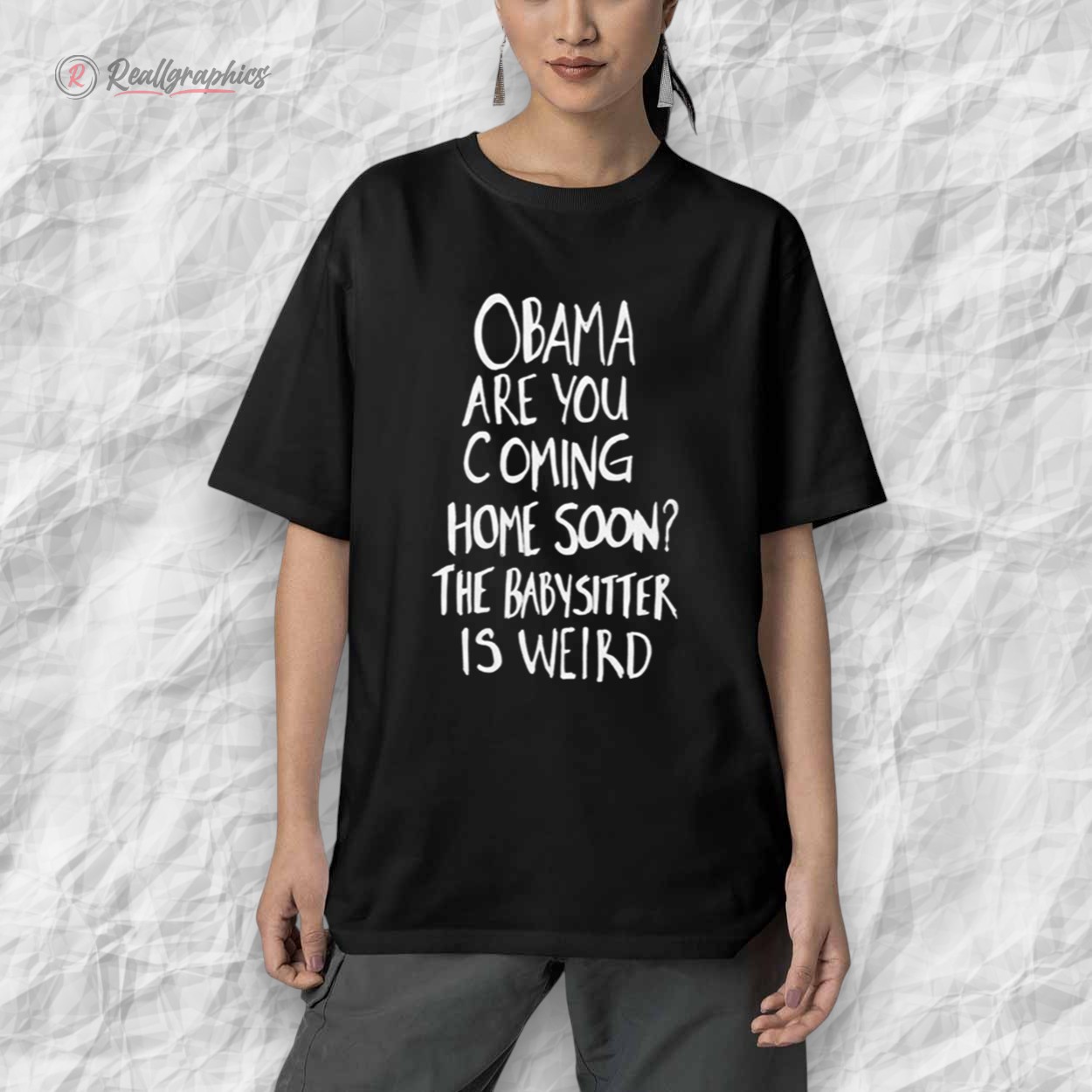 Dive into the world of sharp political satire with this "Obama Are You Coming Home Soon? The Babysitter Is Weird" shirt—a clever jab at leadership transitions that's equal parts nostalgia and cheeky commentary. The handwritten-style text in stark white against a midnight black canvas captures that universal plea for a return to familiarity, poking fun at the chaos that followed Obama's era. It's the ultimate conversation starter for anyone who's ever longed for steadier times in the White House, blending humor with a touch of wistful rebellion.