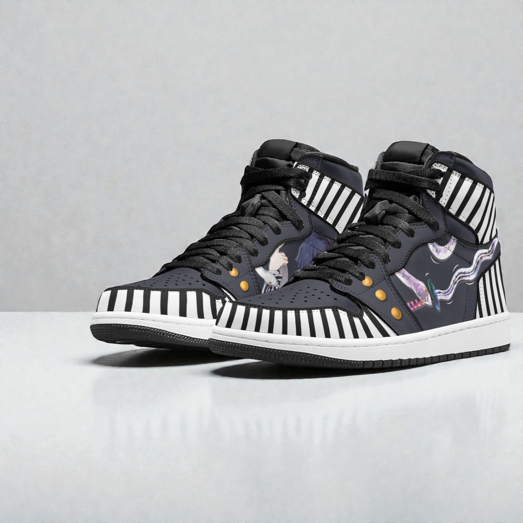 Sharp contrasts catch the eye immediately with these Obanai Iguro sneakers, where stark black-and-white vertical stripes slice through dark navy panels, creating a striking silhouette. The design balances a bold graphic presence with subtle nods to the character’s signature look, while gold eyelets add a touch of understated flair. High-top construction and thick laces bring streetwear grit, matching the fierce energy fans associate with this mysterious and relentless Demon Slayer. Every detail feels purposeful—the crisp lines and shadowy tones evoke Obanai’s composed yet intense personality, making these sneakers more than just footwear. They resonate with anime fans who admire his quiet strength and distinctive style, blending seamlessly into cosplay setups or casual streetwear worn to conventions. It’s a well-crafted way to channel fandom without shouting it from the rooftops. Collectors and sneaker enthusiasts alike will appreciate the attention to character-driven details, while anyone who enjoys expressing their personal interests through clothing will find something uniquely compelling here. Whether it’s a gift for an anime lover or a bold addition to a casual rotation, the Obanai Iguro sneakers hold up well beyond themed events, offering a combination of visual impact and everyday wearability.