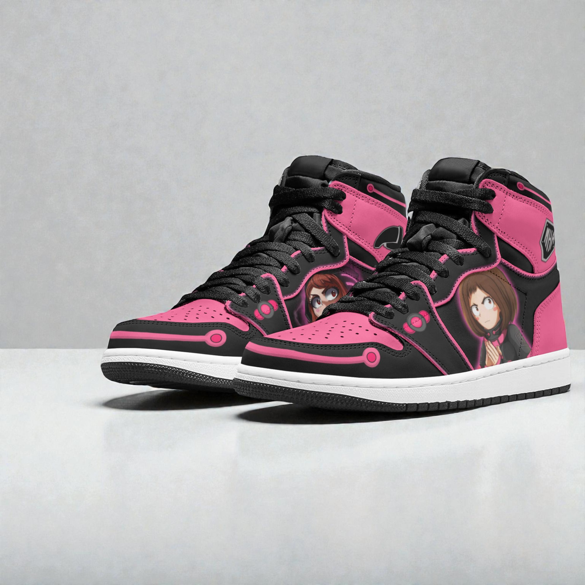 Who says heroes can't have style? These anime boot sneakers showcase a vibrant design featuring Ochaco Uraraka from My Hero Academia. The bold pink and black color scheme, paired with dynamic character imagery, makes these sneakers a must-have for any anime enthusiast. Perfect for adding a touch of heroics to your everyday ensemble.
