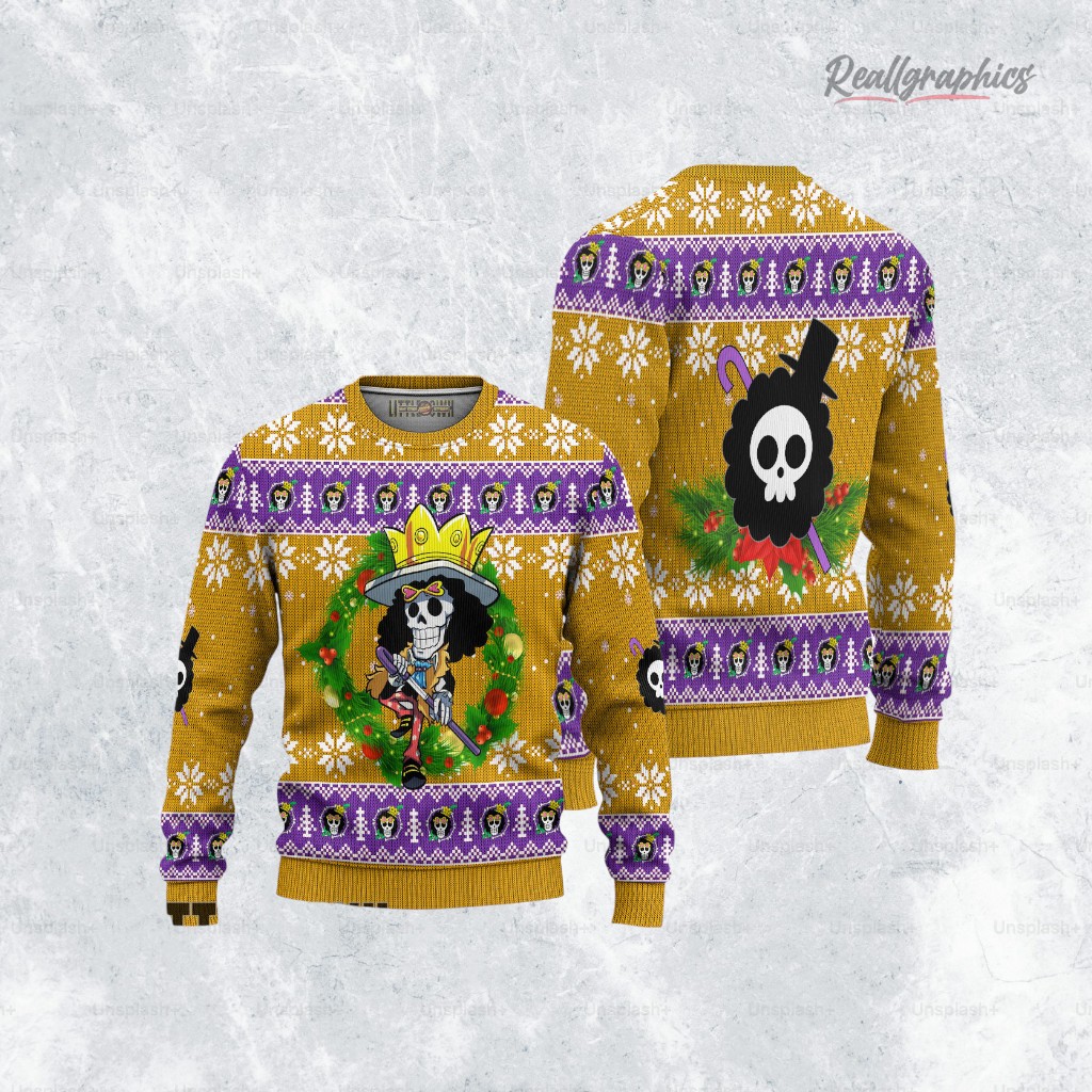 Yohohoho! Get ready to deck the halls with this hilariously spooky Brook Christmas sweater! Bone-afide festive vibes meet the Soul King's unique style. Perfect for any pirate crew's holiday party or a quirky Xmas gift. Time to rock around the Christmas tree…skull style!