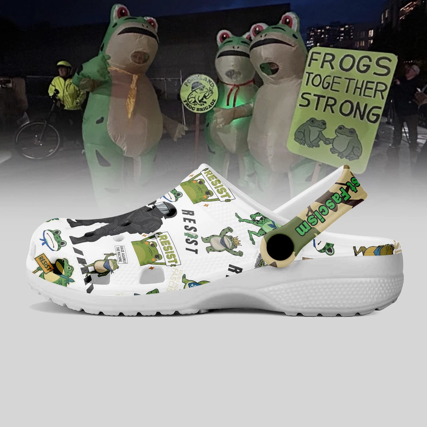 • All-over “Frogs Together Strong” / “Frogs Against Fascism” themed print