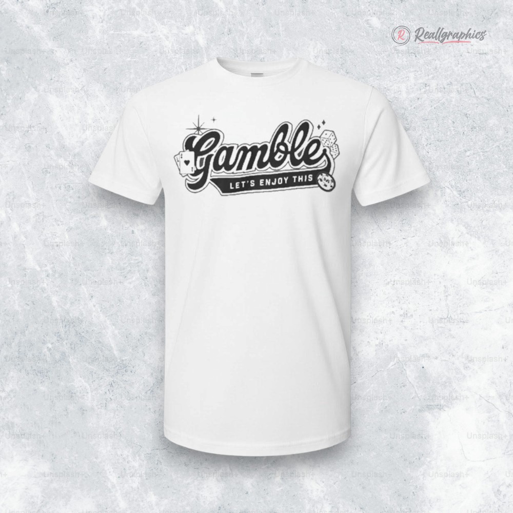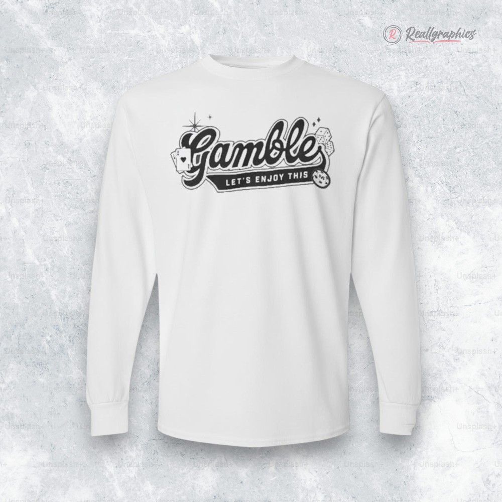 There’s a certain thrill in the way this shirt catches the eye—bold cursive lettering arcs across the chest, outlined sharply to mimic neon lights flickering on a Vegas strip at night. The gamble logo anchors the design with a confident flair, while stylized playing cards and dice spill playfully around it, their crisp white and red details punctuated by sparkling decorative stars. The muted, matte finish balances the retro arcade casino vibe, steering clear of anything too flashy but still unforgettable. This isn’t just a shirt; it’s a nod to anyone who lives for the buzz of the gamble, the calculated risk, and the joy in every unexpected turn. It perfectly fits those who claim casino culture as part of their identity, blending streetwear coolness with a cheeky invitation to keep the game going. Whether the wearer is an experienced hand at poker or just someone who likes owning that playful, confident energy, this long sleeve design feels made for nights that start casual and end with stories worth telling. The gamble shirt suits game nights, casual hangouts at the bar, or quiet weekends spent betting on chances less literal. It’s just as comfortable as it is expressive, making it a thoughtful gift for anyone who thrives on that balance of luck and style, where every roll of the dice is a chance to enjoy the moment.Premium Vegas matt gamble let's enjoy this Shirt
