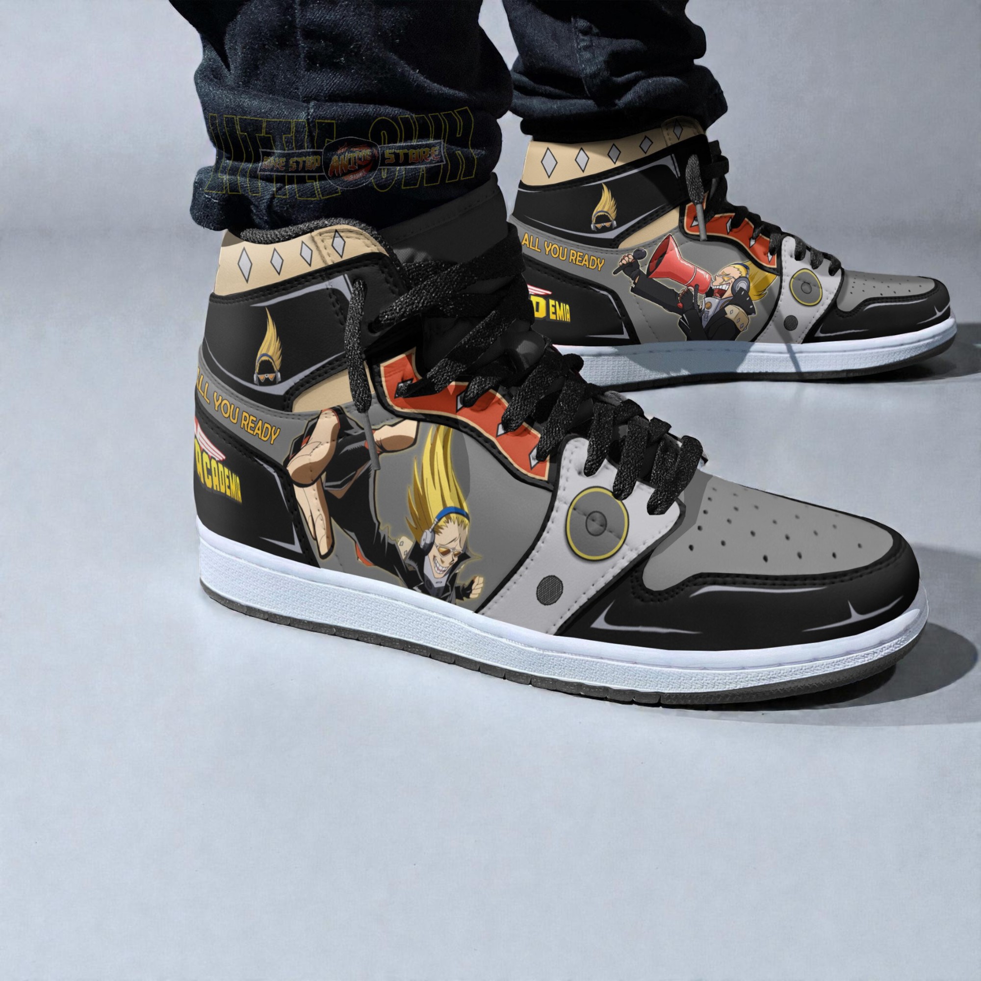 if you're into My Hero Academia and sneakers, these Present Mic Jordan boots are seriously something else. They’ve taken that comic panel style you see in manga and just blown it up across the shoe, with bold outlines and action scenes that feel like the pages literally came to life. The colors are mostly black, gray, and white, but then you get these sharp pops of red and yellow that really punch through, plus some beige accents that keep it from being overwhelming. It’s like wearing a mini anime showdown on your feet. The graphics aren’t just slapdash prints either — the designs have this dynamic, chaotic energy that really matches Present Mic’s vibe. There are these comic-book style text bubbles and action burst effects, but they’re more like visual texture than full-on readable words, which keeps it fresh and visually interesting without getting too noisy. Also, the metallic bits peppered throughout give it a cool edge, adding a subtle futuristic feel that fits right into the anime’s world. Honestly, if you’re a sneakerhead who also loves bold streetwear, or someone who’s deep into My Hero Academia, this is such a fun way to show your fandom without just rocking a T-shirt. I can totally see cosplayers topping off their outfit with these, or anyone wanting a standout conversation piece for conventions or casual hangouts. They’re definitely not your everyday shoe, but that’s what makes them fun to wear when you want to switch it up. Plus, if you’re ever stuck on what to get a friend who’s a die-hard anime fan or collector, these could be a pretty cool surprise. They bring together that love for the series and high-contrast, graphic style in a way that feels fresh and wearable—not just a one-time thing you stuff on a shelf. All in all, for anyone chasing unique My Hero Academia sneakers with some real personality, these stand out without being too over the top.