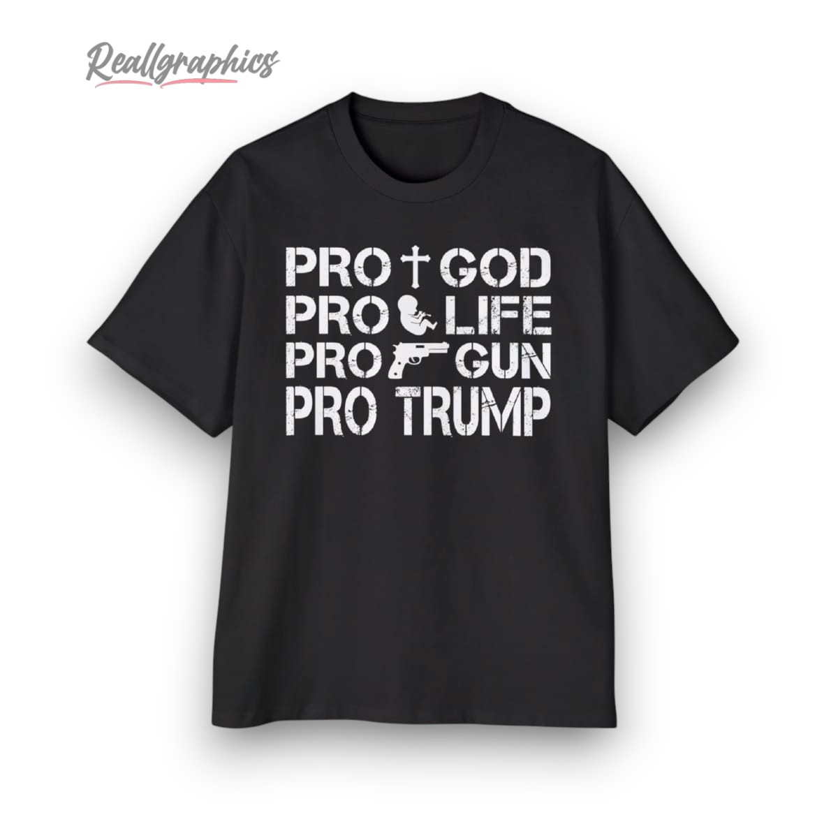 Express your beliefs boldly with this impactful design highlighting faith, life, and political stance. Featuring a striking white print with symbolic icons, it's perfect for making a statement. This shirt connects faith, advocacy, and leadership, making it ideal for those who stand firmly in their values. A conversation starter for any occasion, it's more than a shirt—it's a declaration.