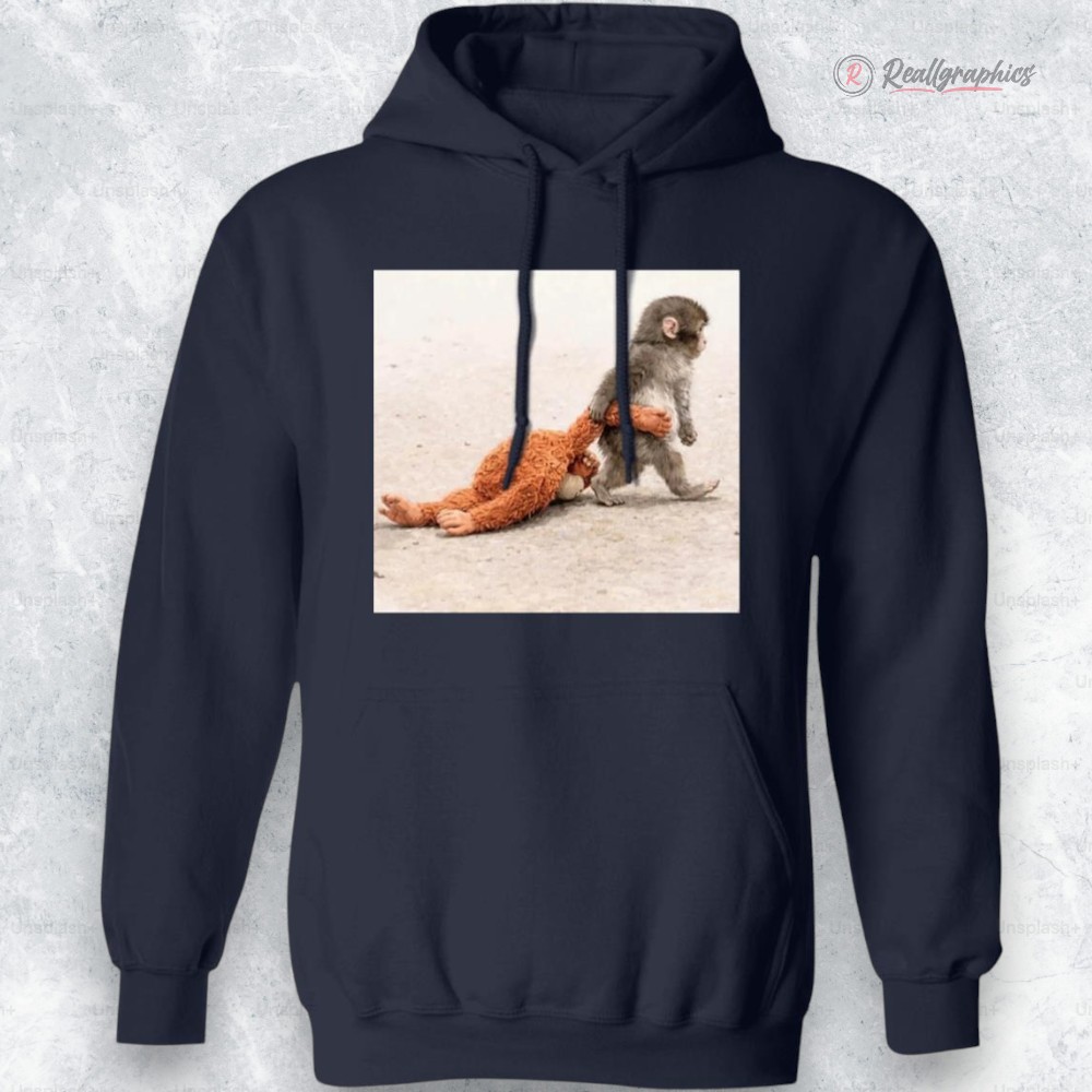A sense of individuality often comes from the small, unexpected touches that reveal a playful side beneath a calm exterior. Here, a modest square photo sits centered on a soft hoodie, capturing a brief, mischievous moment: a small monkey delicately tugging at a stuffed monkey lying on sun-warmed sand. The image balances innocence with a touch of cheekiness, a quiet nod to those who appreciate humor that doesn’t shout but instead invites a knowing smile. This design speaks to people who find joy in subtle quirks and who enjoy wearing something that reflects that lighthearted mischief. It fits comfortably into casual days, a conversation starter for those who value clever animal interaction without overselling its whimsy. The phrase “punch the monkey” lingers playfully in the mind, suggesting a spirited attitude wrapped in soft fabric, perfect for those who don’t take themselves too seriously yet are deeply aware of their unique style. Young adults and anyone drawn to witty, understated humor will find a genuine connection here. Whether worn in the company of friends or kept as a relaxed statement piece, it feels personal—like a private joke shared through an image. It’s an appealing choice for animal lovers or those looking to gift something that blends charm with a wink, quietly encouraging expression through a simple, amusing snapshot.