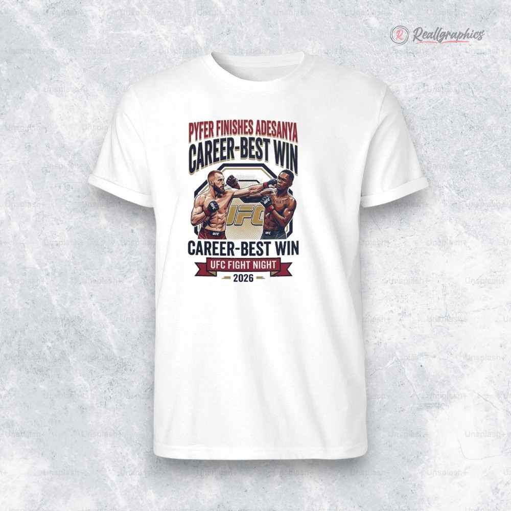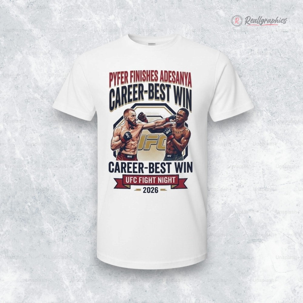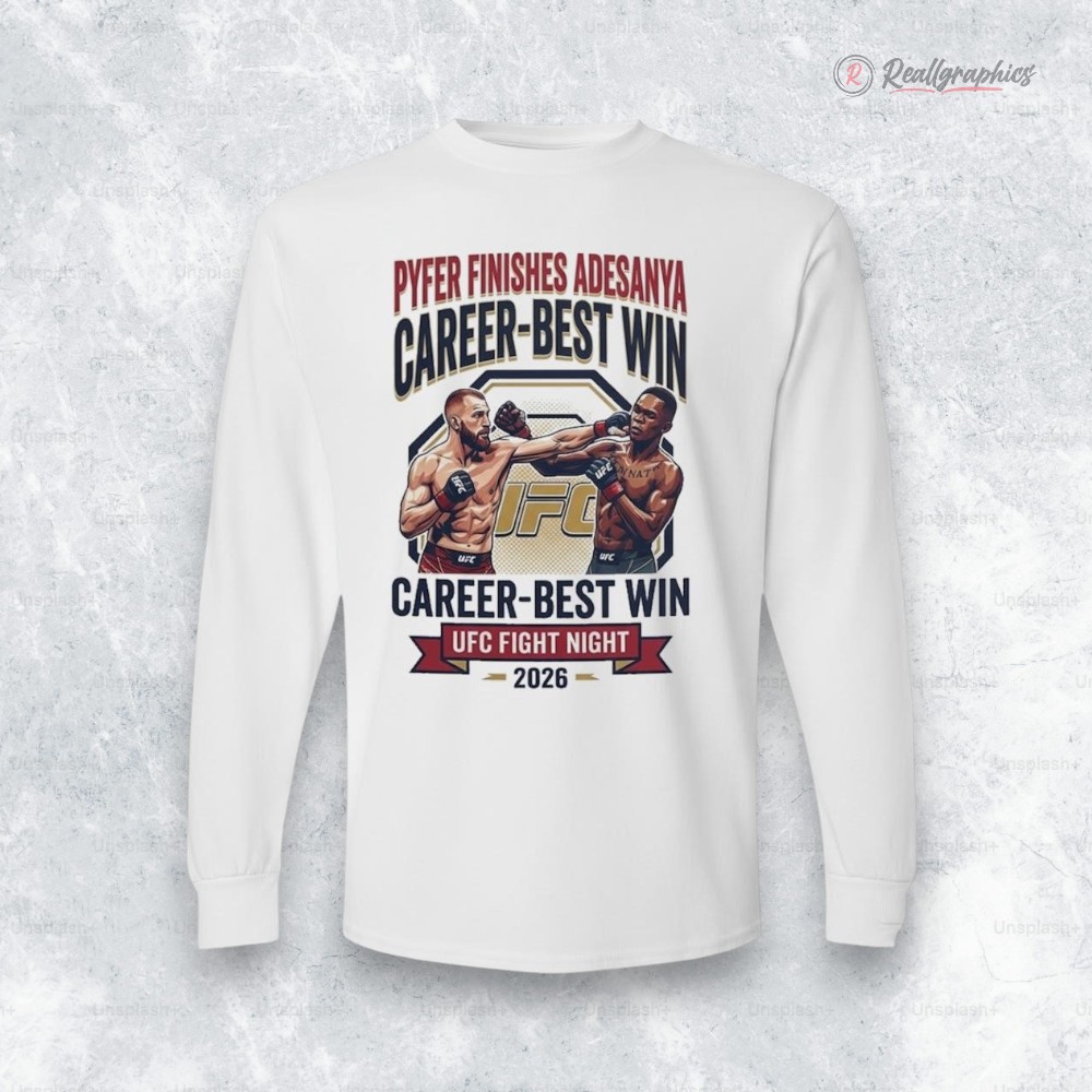 Kamaru Usman’s dominance isn't just about skill—it’s a statement of legacy. The Pyfer finishes Adesanya in career best win at UFC Fight Night Shirt captures that electricity with a bold long-sleeve design that feels alive with motion. The front showcases a fierce fighter illustration, frozen mid-action, muscles tensed and eyes locked, layered seamlessly with a strong sans-serif font that stacks the moment’s headline like a rallying cry. The UFC logo anchors it all, grounding the graphic in the authenticity of the Octagon. This isn’t just apparel; it’s a wearable snapshot of a defining night that reverberates through the MMA community. The energetic banners and high-contrast typography bring the vibe of a victory poster off the wall and straight into your wardrobe. Anyone who tracks fight nights or debates highlight reels will see the shirt as more than fabric—it’s a nod to the grit, strategy, and raw power that shape the sport. Whether you’re catching the next big match, hanging out with fellow MMA enthusiasts, or adding to a growing collection of fight memorabilia, this UFC Fight Night shirt carries weight. It’s the kind of gear that sparks conversations, honors career-defining moments, and fits right into the lifestyle of those who live for the clash inside the cage.