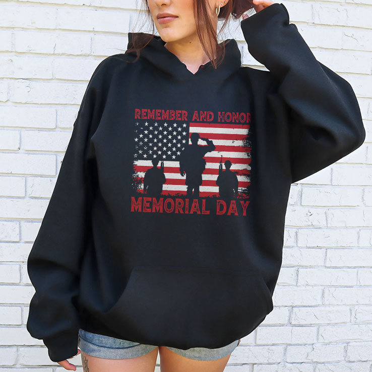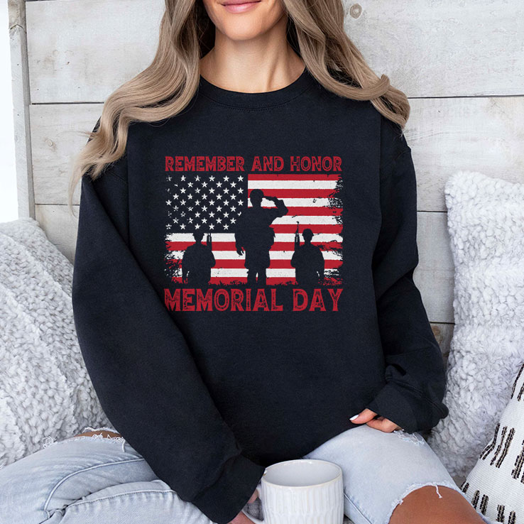 The bold silhouette of three figures standing at attention catches the eye immediately, their crisp outlines set against the familiar stars and stripes of the American flag. The flag itself stretches across the shirt’s chest, rendered in a distressed red that looks weathered yet strong, like a banner carried through decades of history. Thick, uppercase letters spell out a message of remembrance, their rough edges echoing the rugged resilience the design honors. The typography and imagery balance nicely—the figures of saluting soldiers centered steadily between the flag’s stripes, while the bold lettering anchors the whole composition with purpose. There’s a grounded feeling to this shirt, one that speaks clearly without needing flash or flair. It taps into a shared sense of respect and commemoration, the kind that quietly marks a day set aside for reflection. People who appreciate symbols of service and sacrifice might find it speaks to an identity they carry close, whether veterans, family members of those who served, or anyone who quietly honors those moments of history every year. The design feels like a thoughtful nod, not loud or showy, but sincere and meaningful. Worn with a pair of worn jeans on a late spring afternoon picnic or during a backyard gathering with friends and family, this Remember And Honor Memorial Day shirt fits naturally into routines where remembrance is part of the larger picture—ordinary days made a little more intentional by what the design represents.