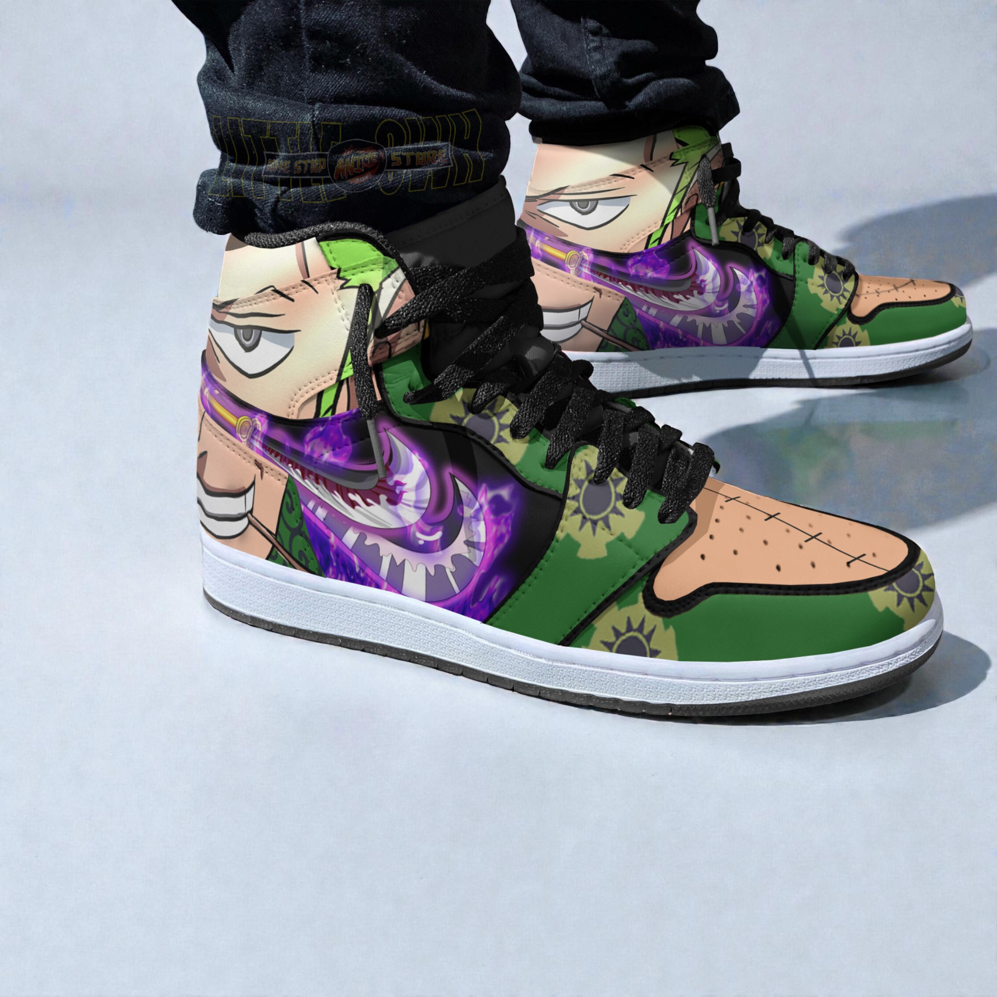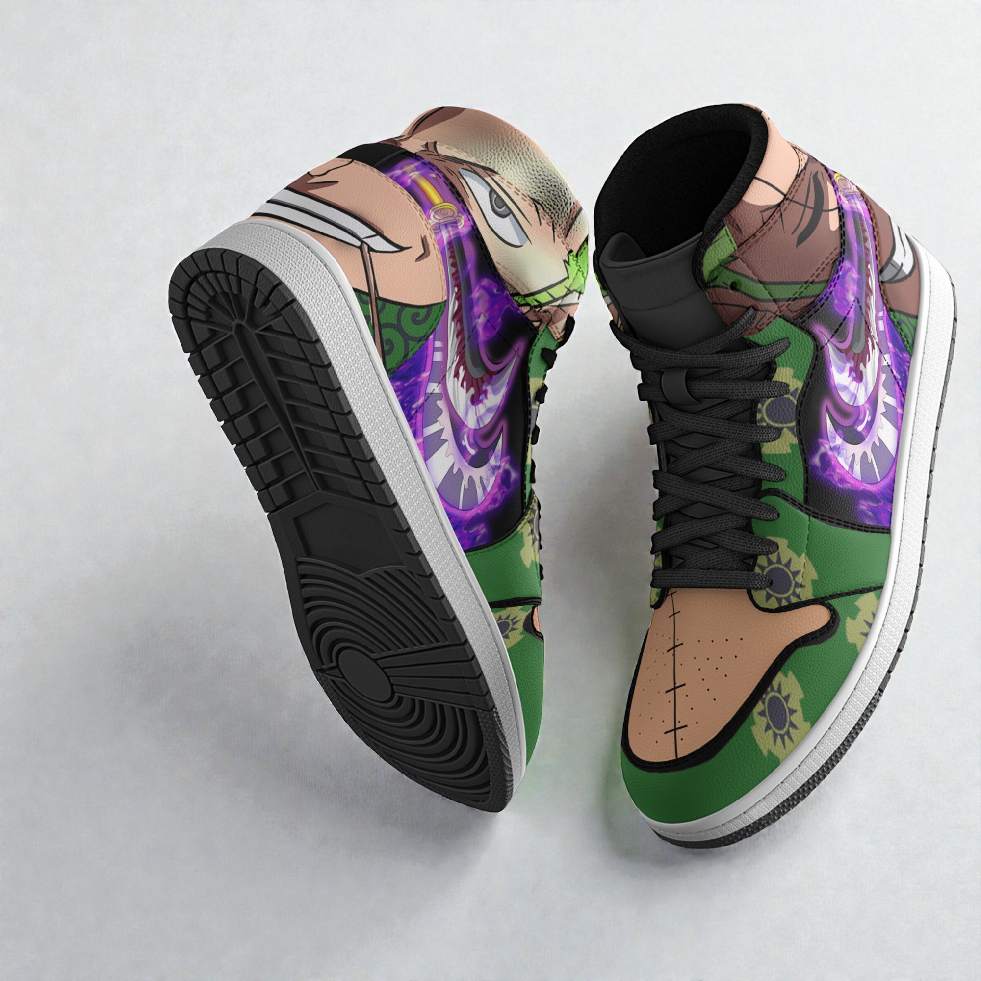 The clash of deep green panels against vivid purple swirls commands attention, while sharp black outlines crisply define each cartoon face amid a burst of multicolored abstract shapes. The beige toe caps ground the design, balancing the energetic palette with subtle earthiness. A sun motif peeks through the composition, adding warmth to the dynamic blend of colors and forms. Each element feels purposely placed – the purple Nike swoosh weaves through the artwork like a ribbon of movement, echoing both the intensity and grace of the character it celebrates. These shoes aren’t just about striking looks; they carry a narrative fueled by the bold spirit of Roronoa Zoro’s Wano arc. Vibrant and unapologetic, they invite wearers to embrace individuality and fandom without restraint. The energetic, streetwear-inspired vibe suits those who find identity in their passions—a loud statement for anime lovers who want their sneakers to reflect more than just style. Collectors with a keen eye for themed footwear or enthusiasts planning their next convention outfit will recognize the unique blend of culture and personality these shoes offer. They’re designed to resonate with anyone who sees fashion as an extension of the stories they hold close, blending seamlessly into casual wear while still turning heads. The Roronoa Zoro Wano Arc custom shoes provide that rare mix of visual impact and cultural connection, making everyday moments just a bit more expressive.